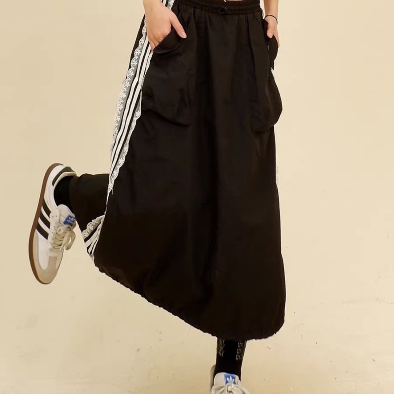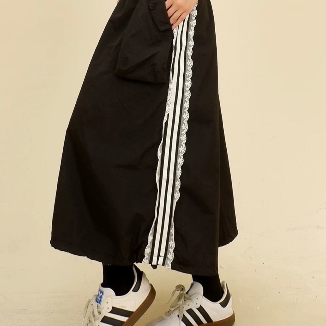 スポーティーなラインデザインに繊細なレースをプラスした、個性派スカート。