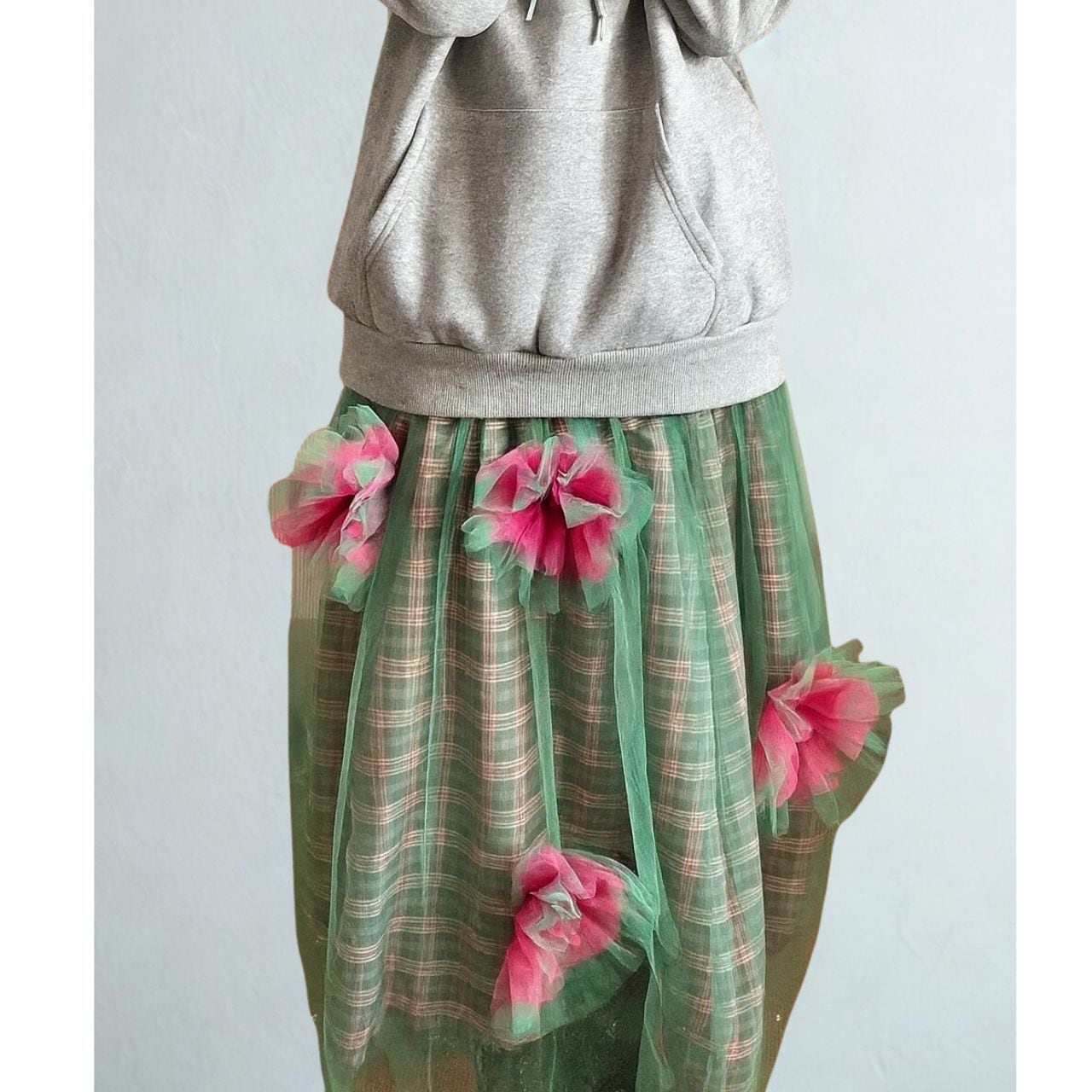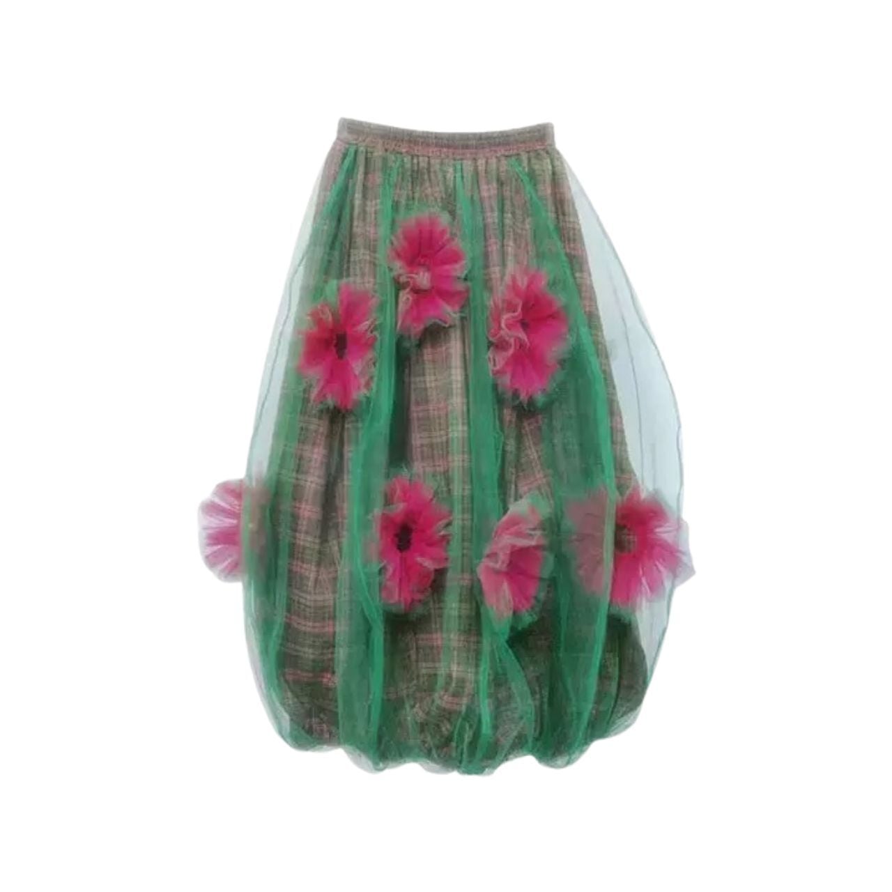 立体的なフラワーモチーフとチュールの重なりが華やかな印象のスカート。
