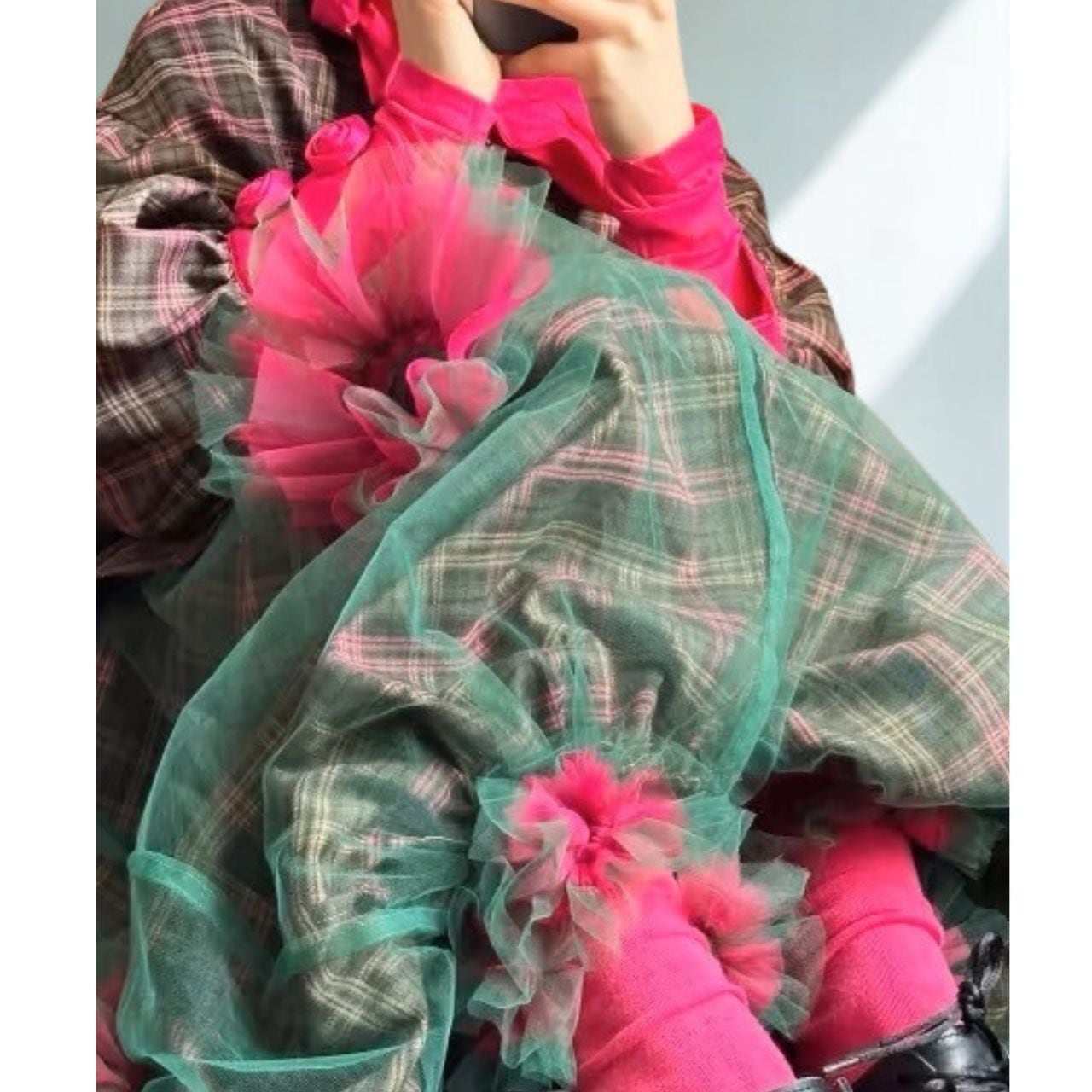 チェック柄の生地をベースに重ねたレイヤード仕様で、