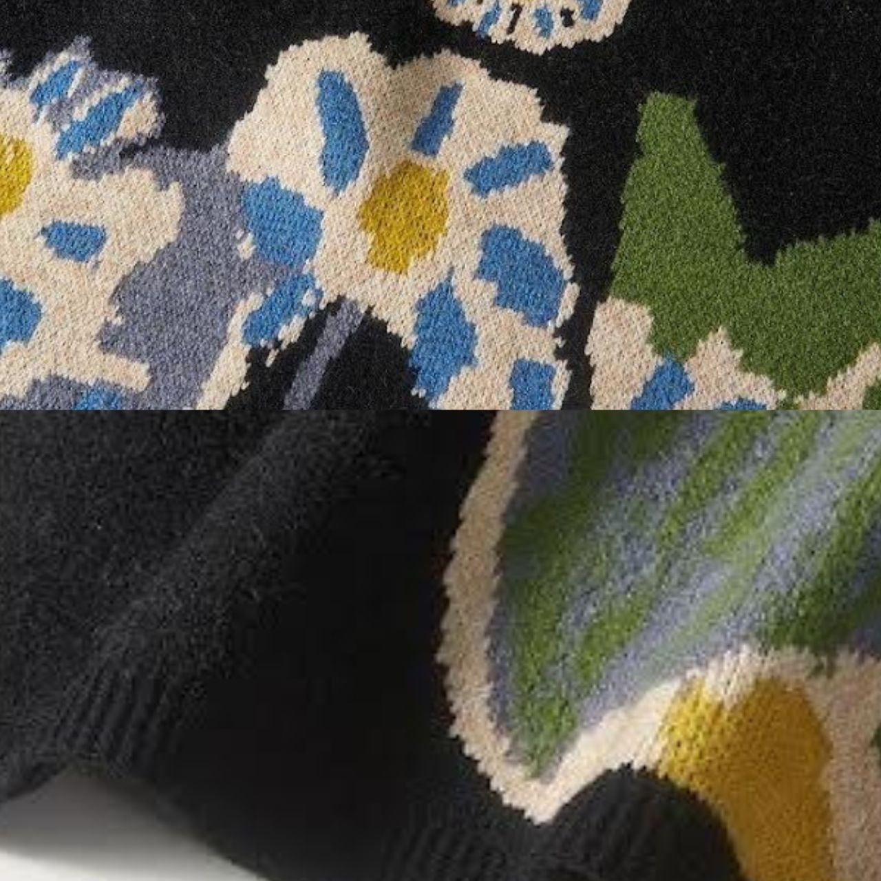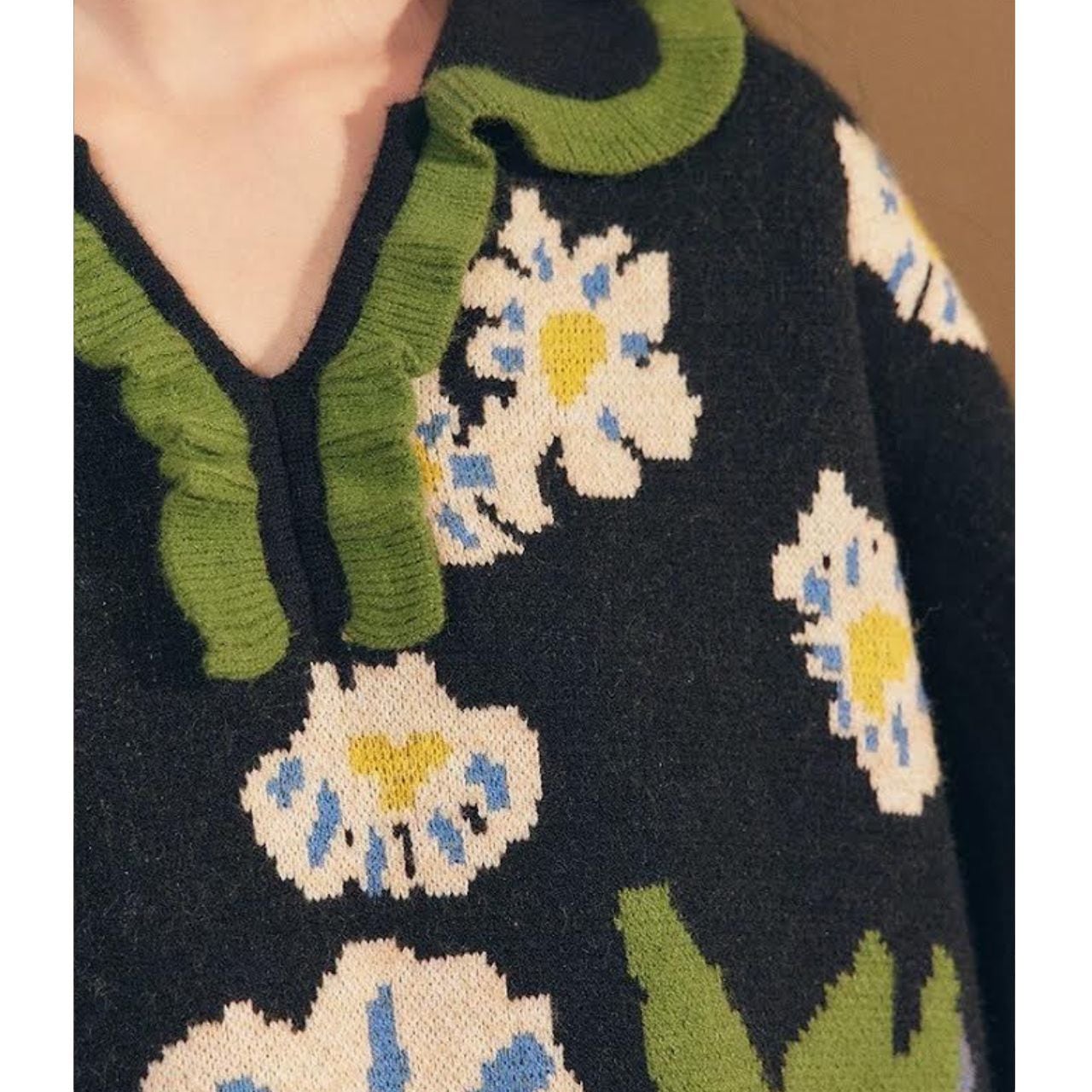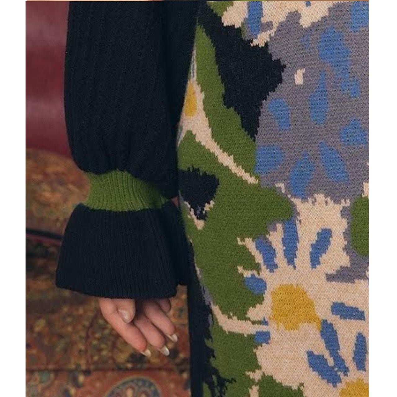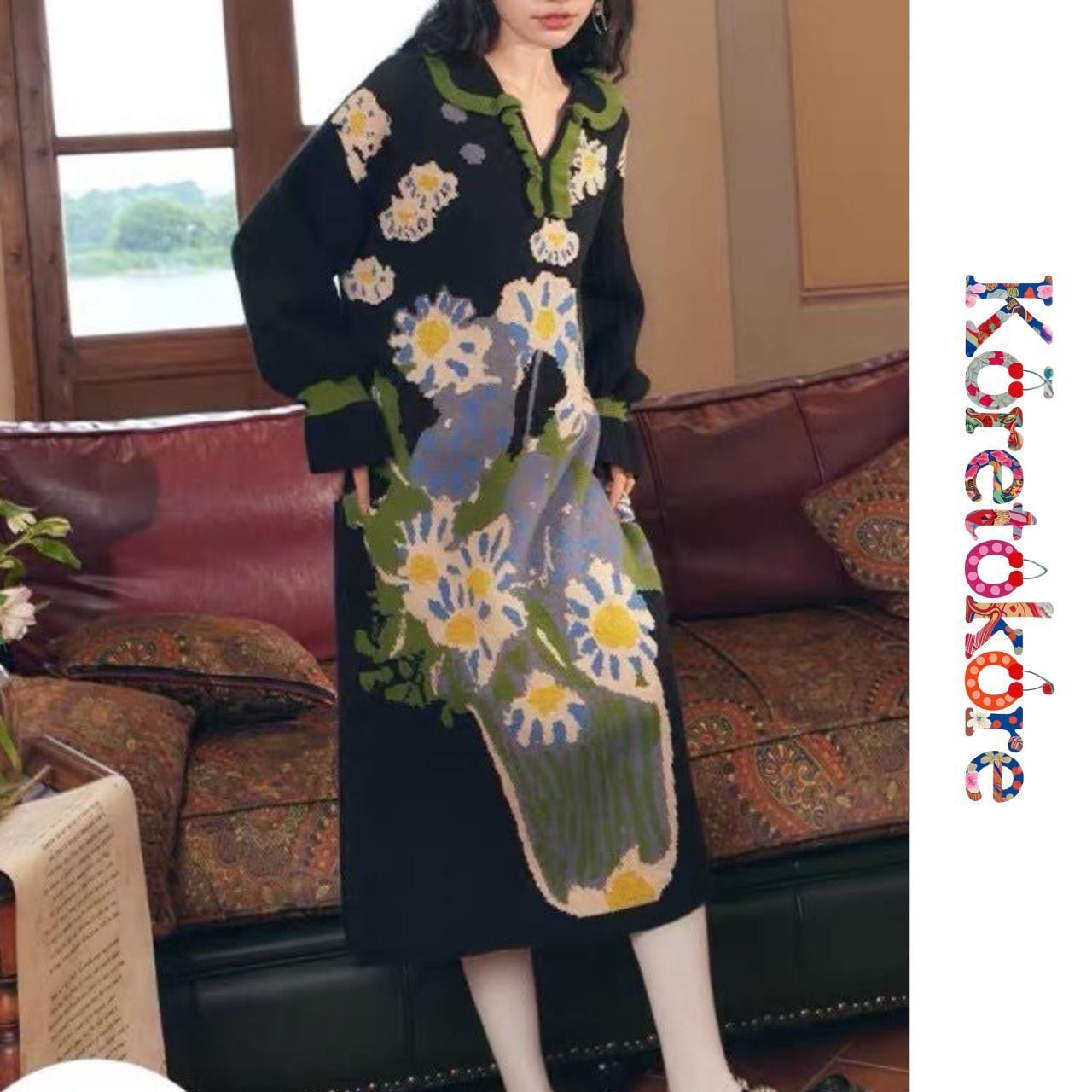 アート感あふれる花柄ニットワンピース。