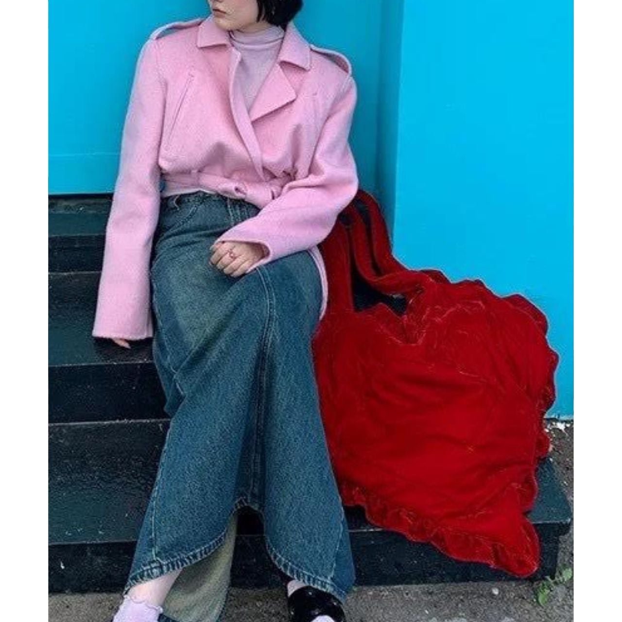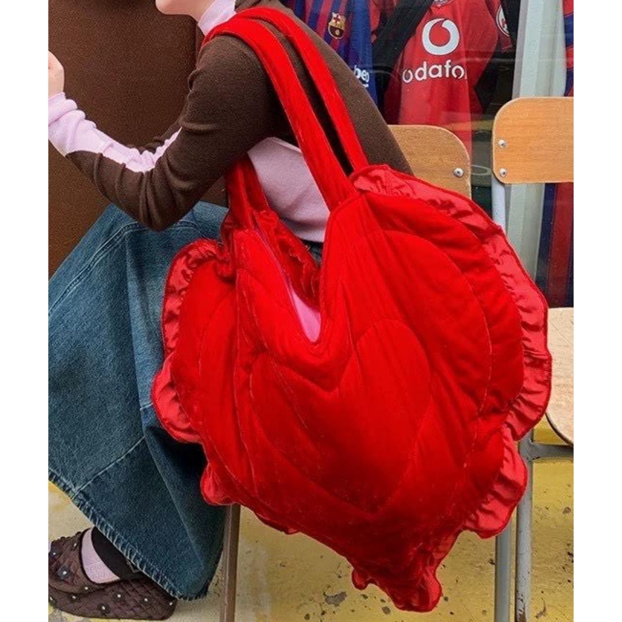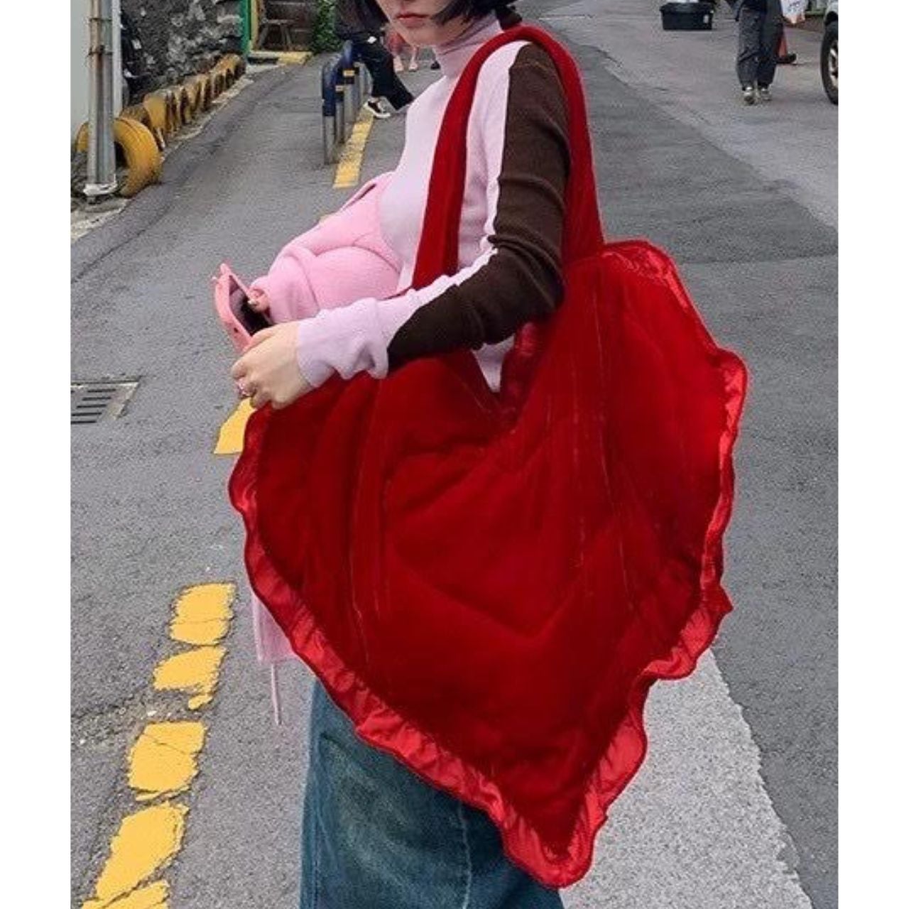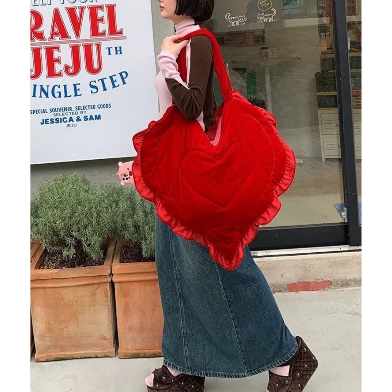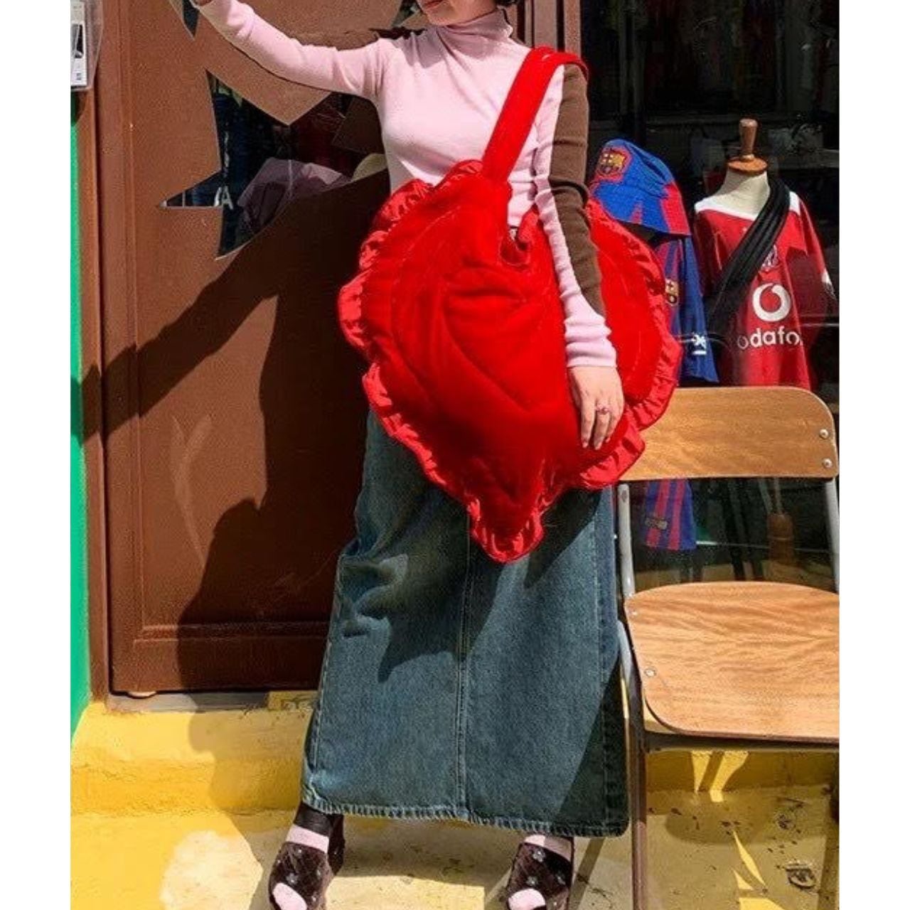 鮮やかなレッドのハートシルエットバッグ。