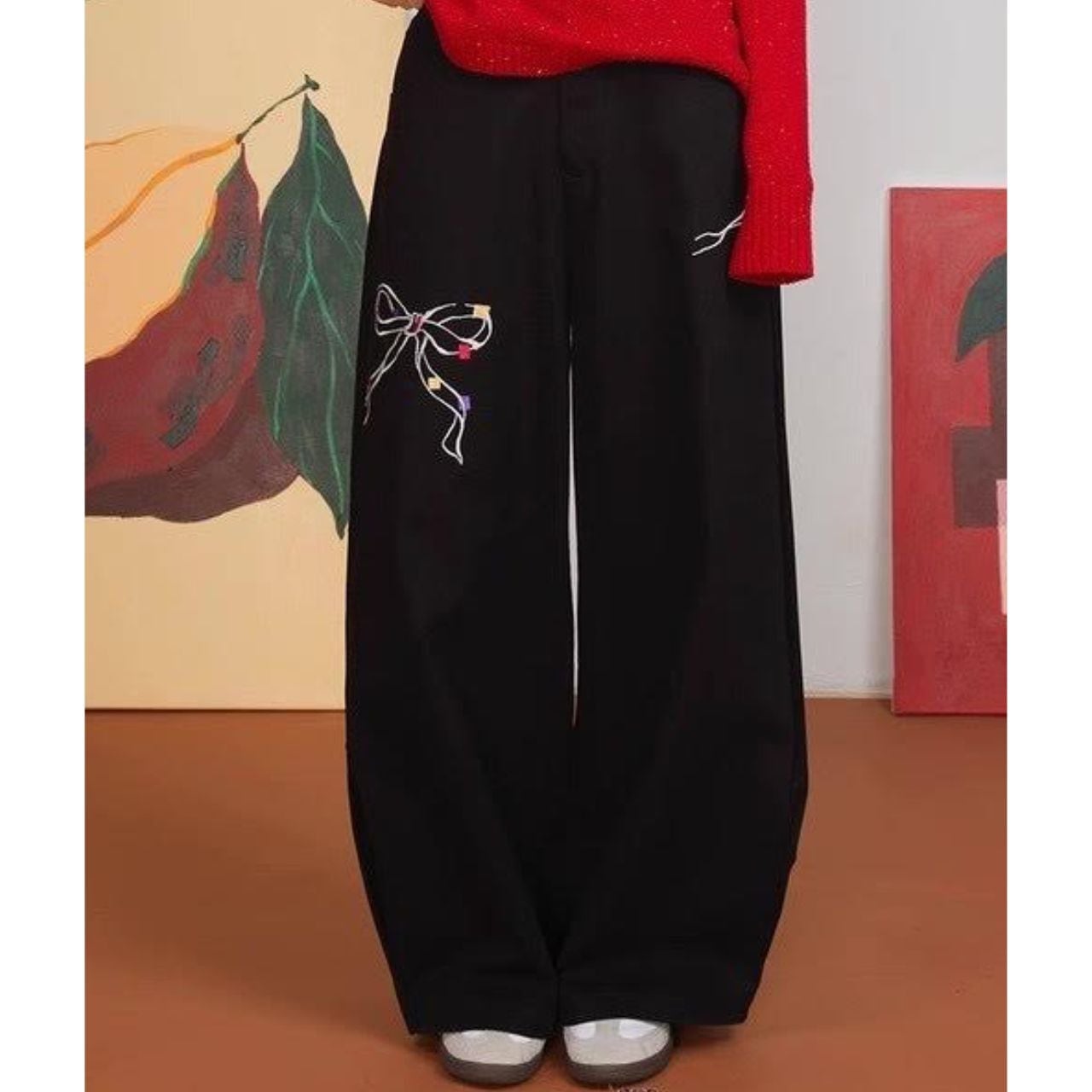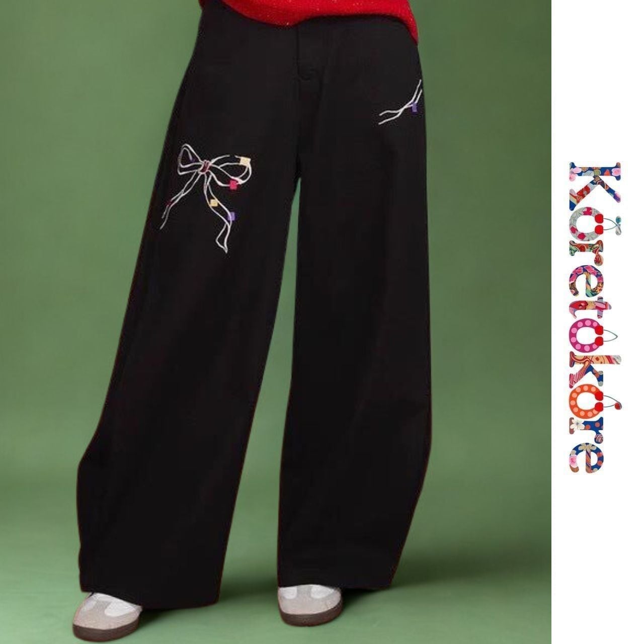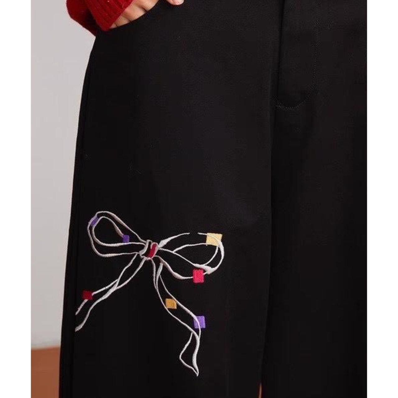 立体的なリボン刺繍が印象的なワイドパンツ。