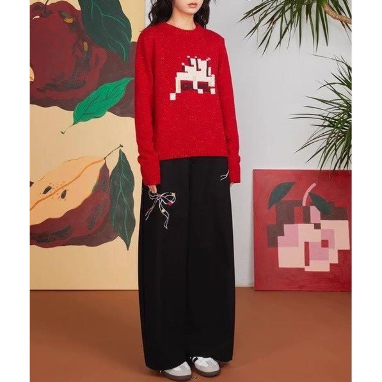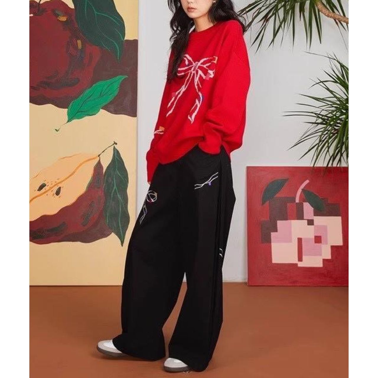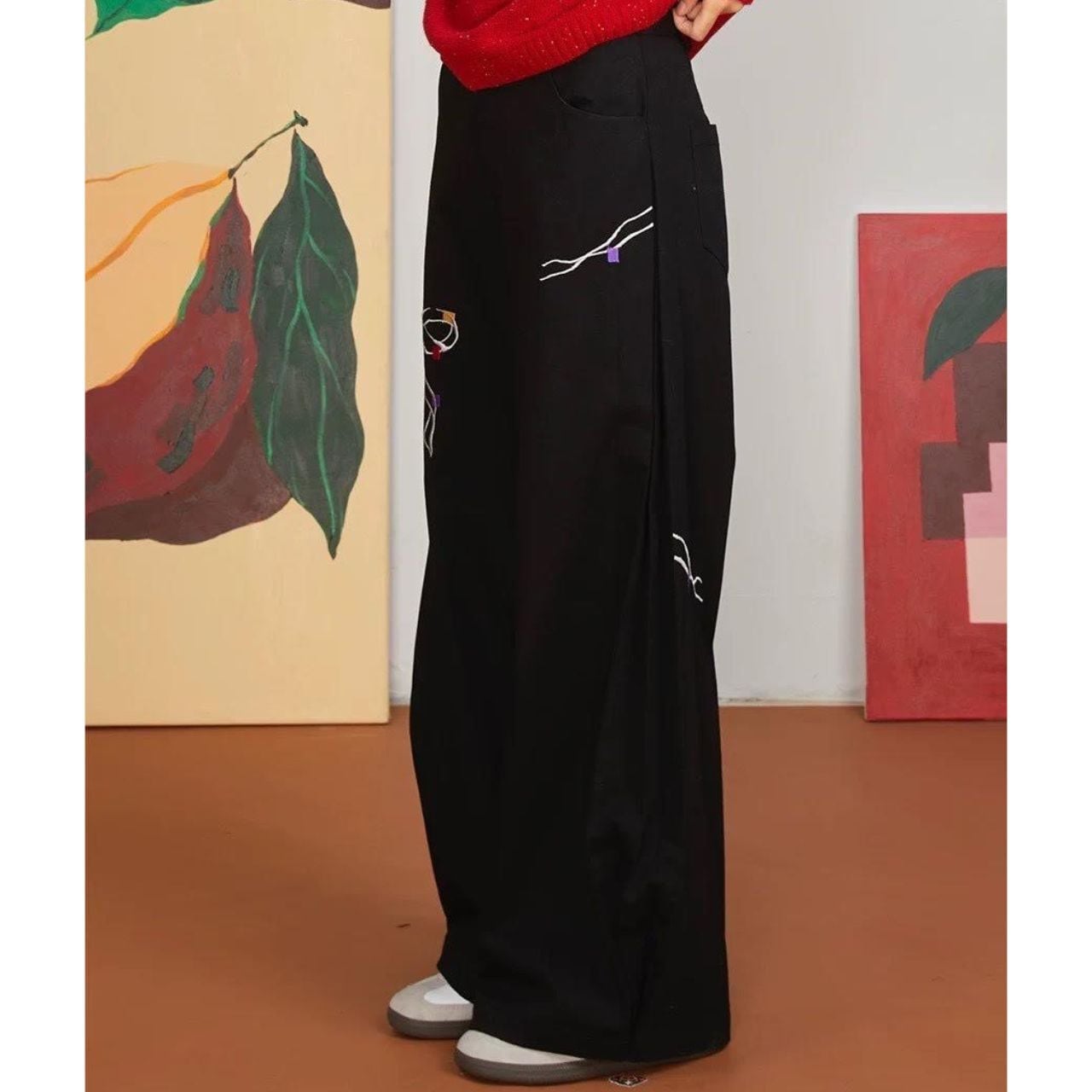 立体的なリボン刺繍が印象的なワイドパンツ。