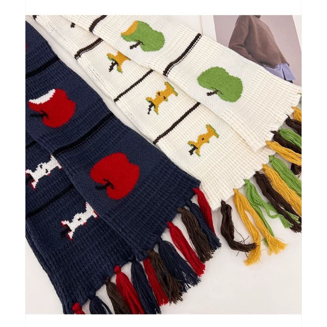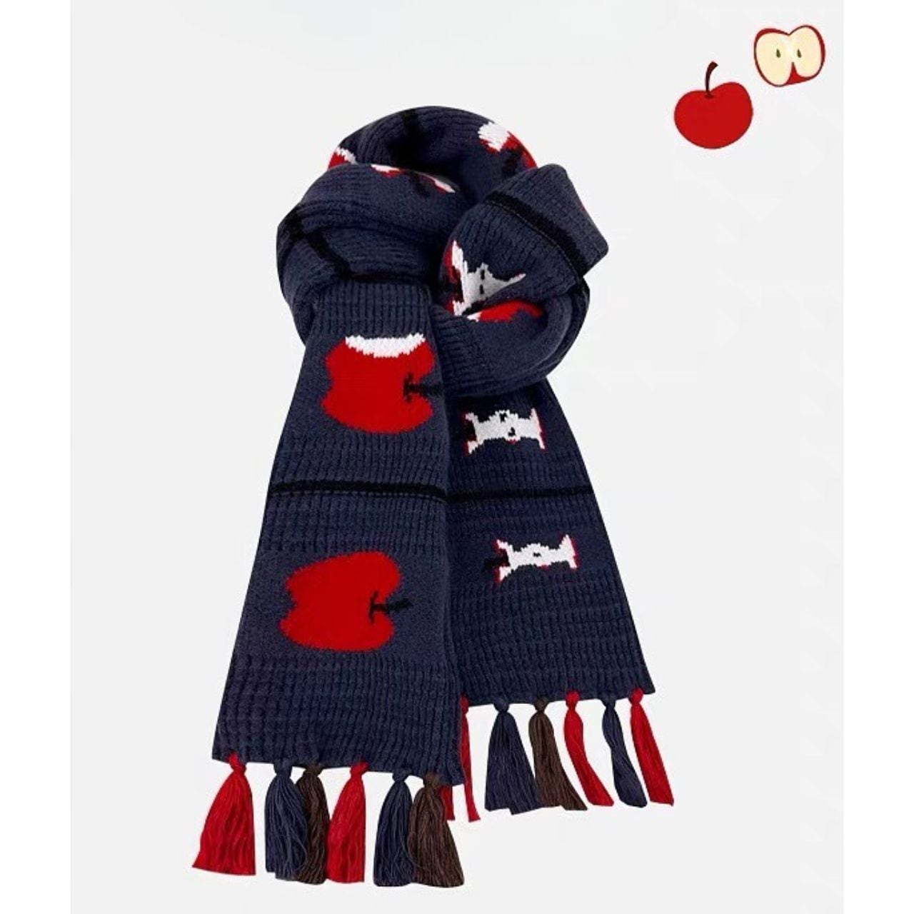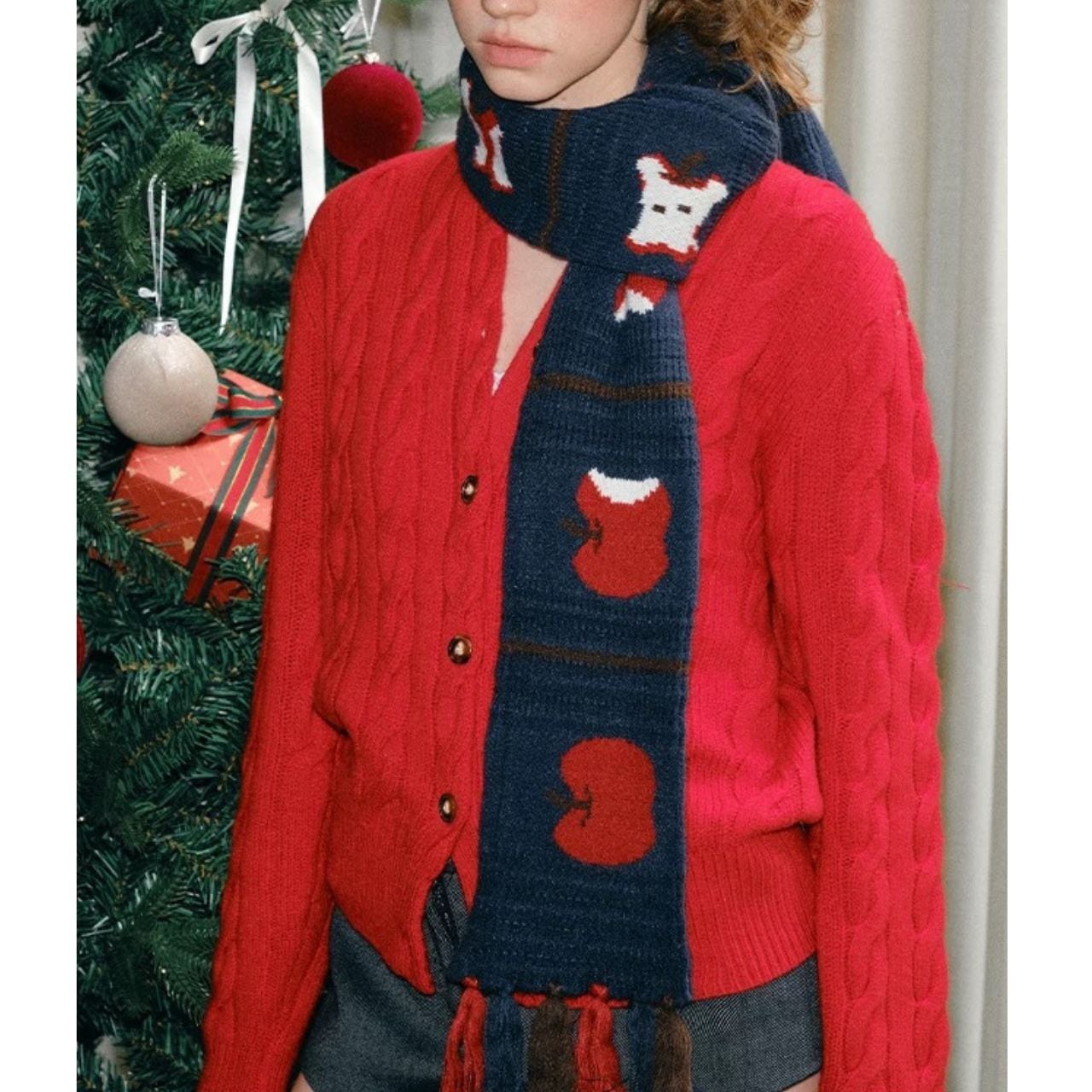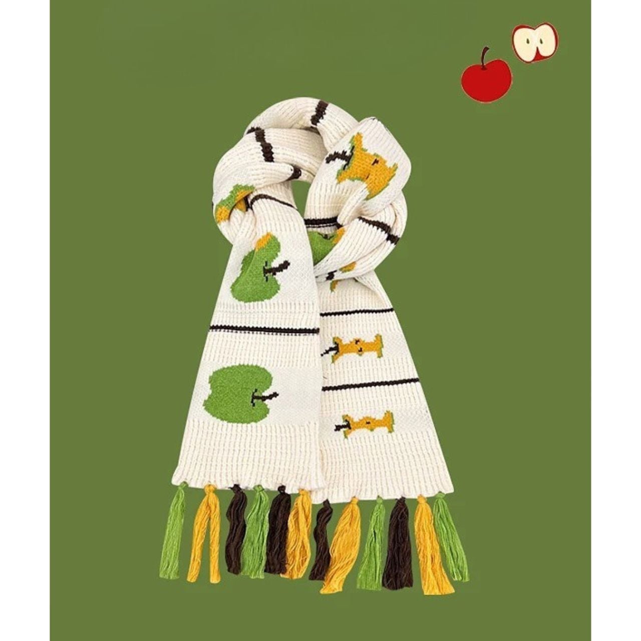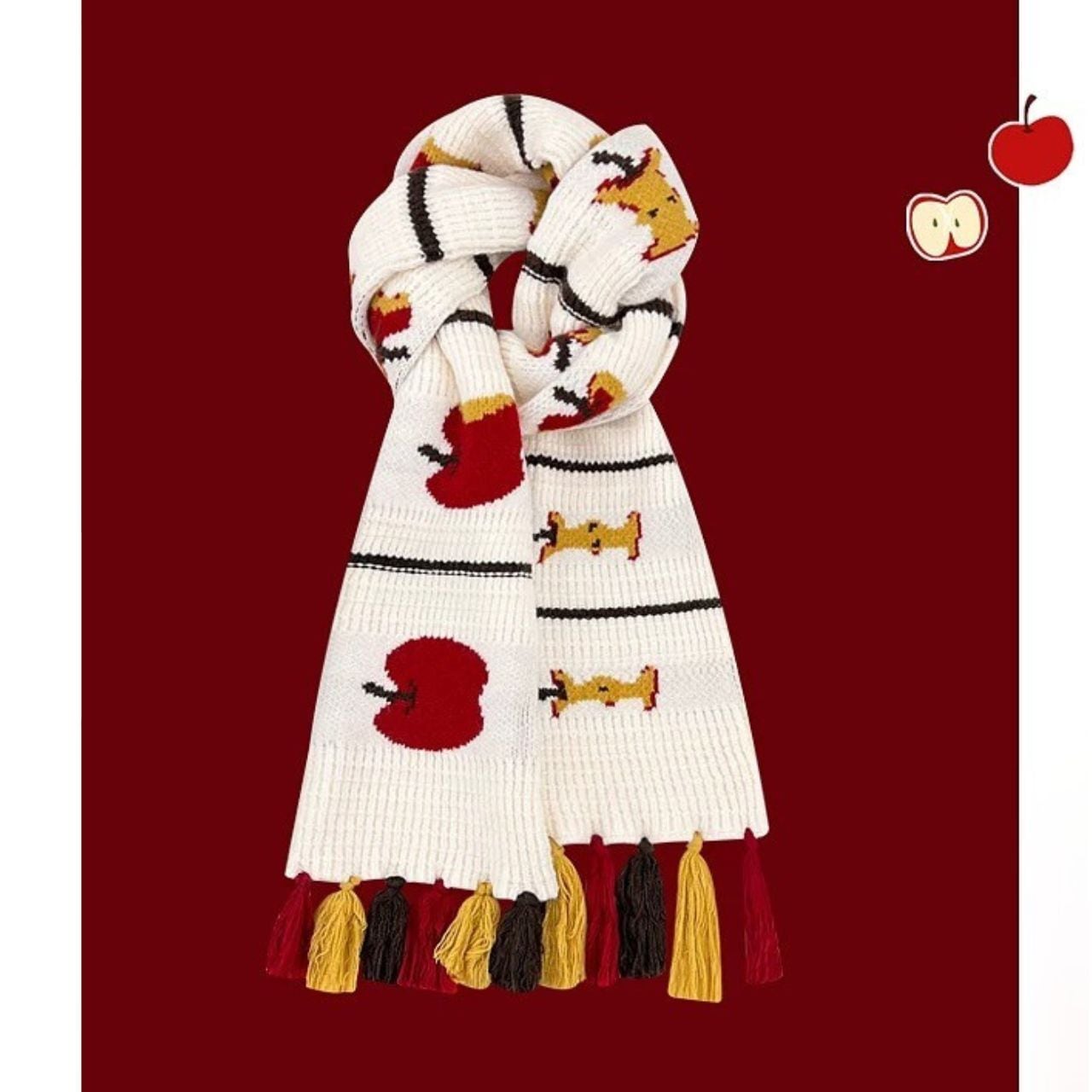 冬のコーデに遊び心をプラスする、りんごモチーフの厚手ニットマフラー。