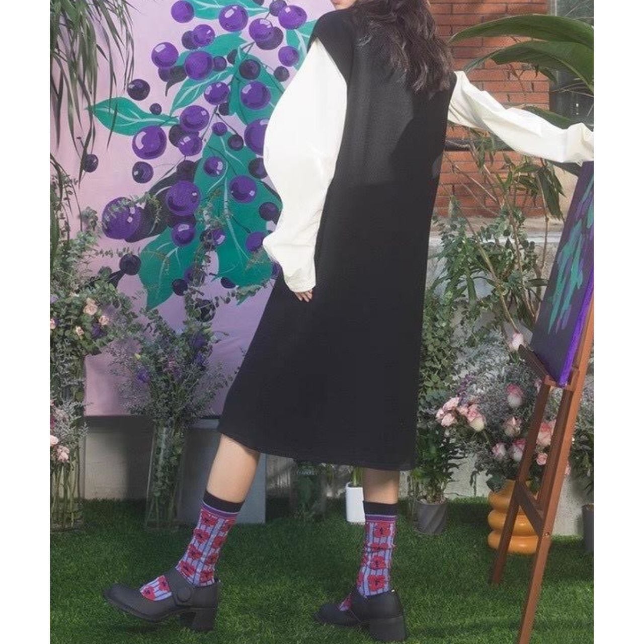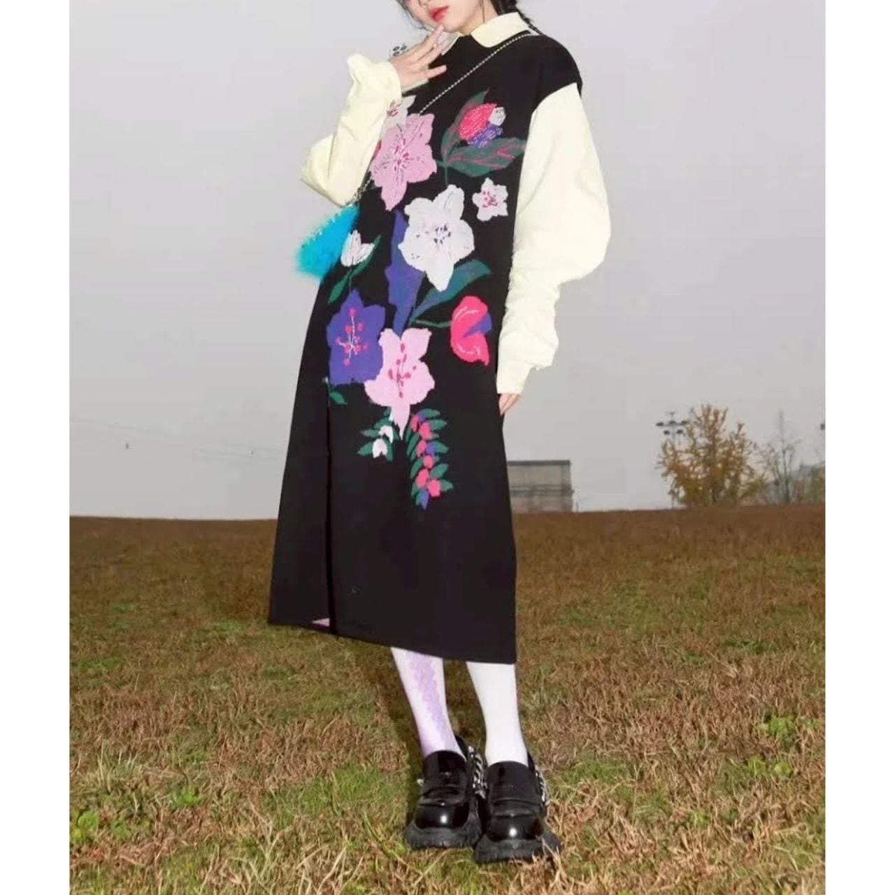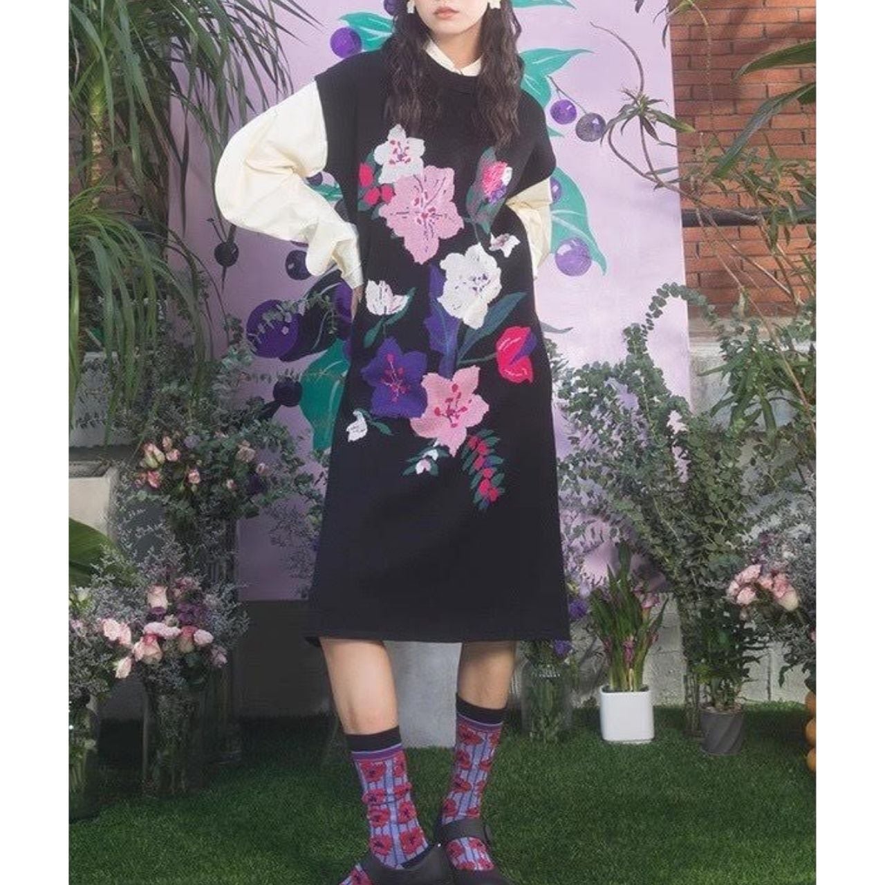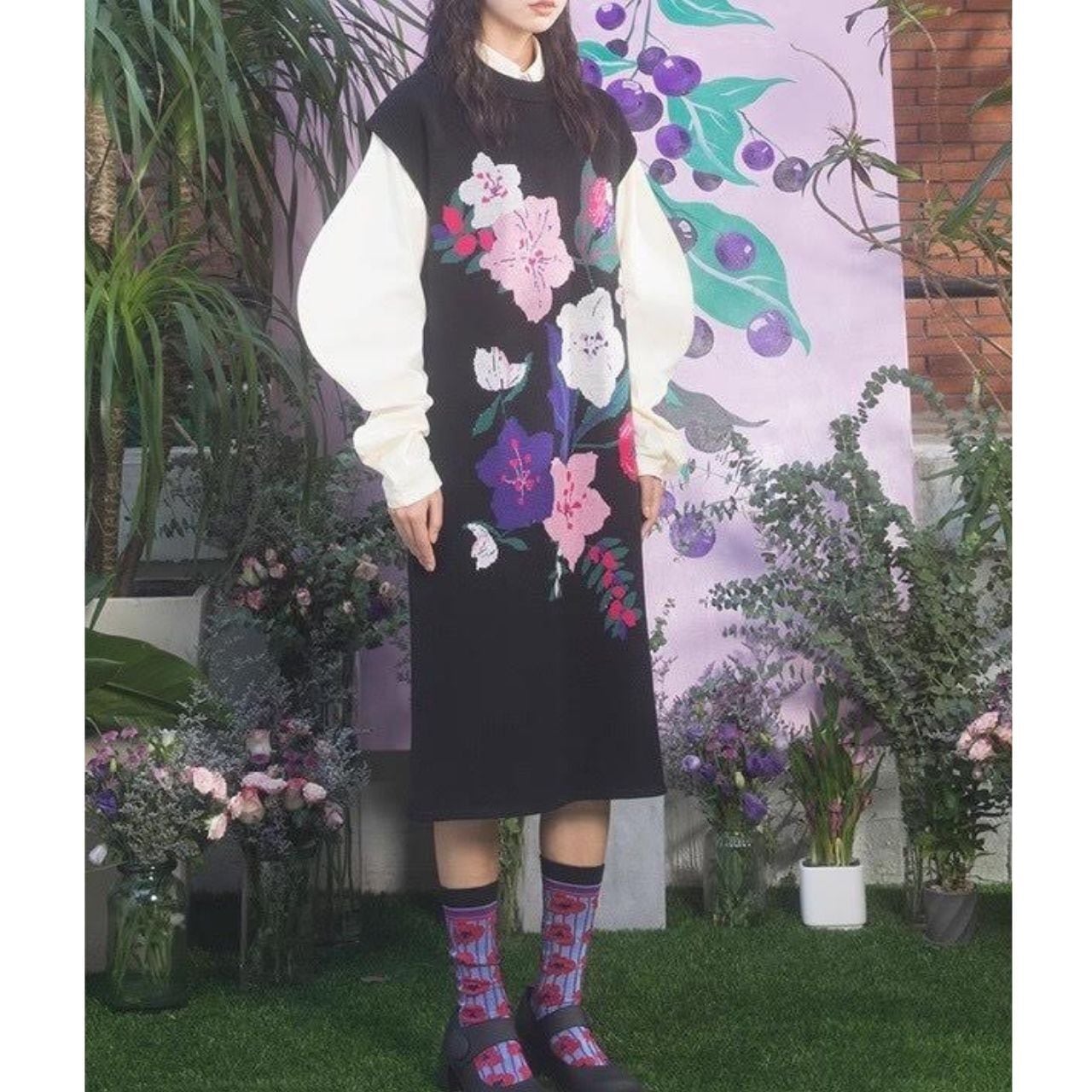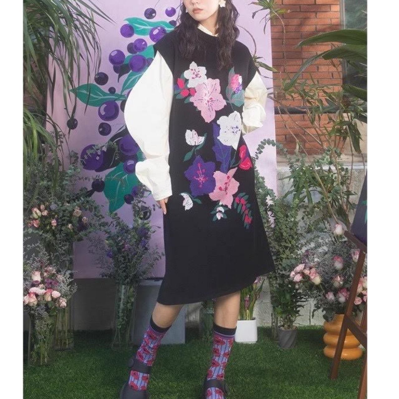 手描き風の花柄が大胆にあしらわれた、