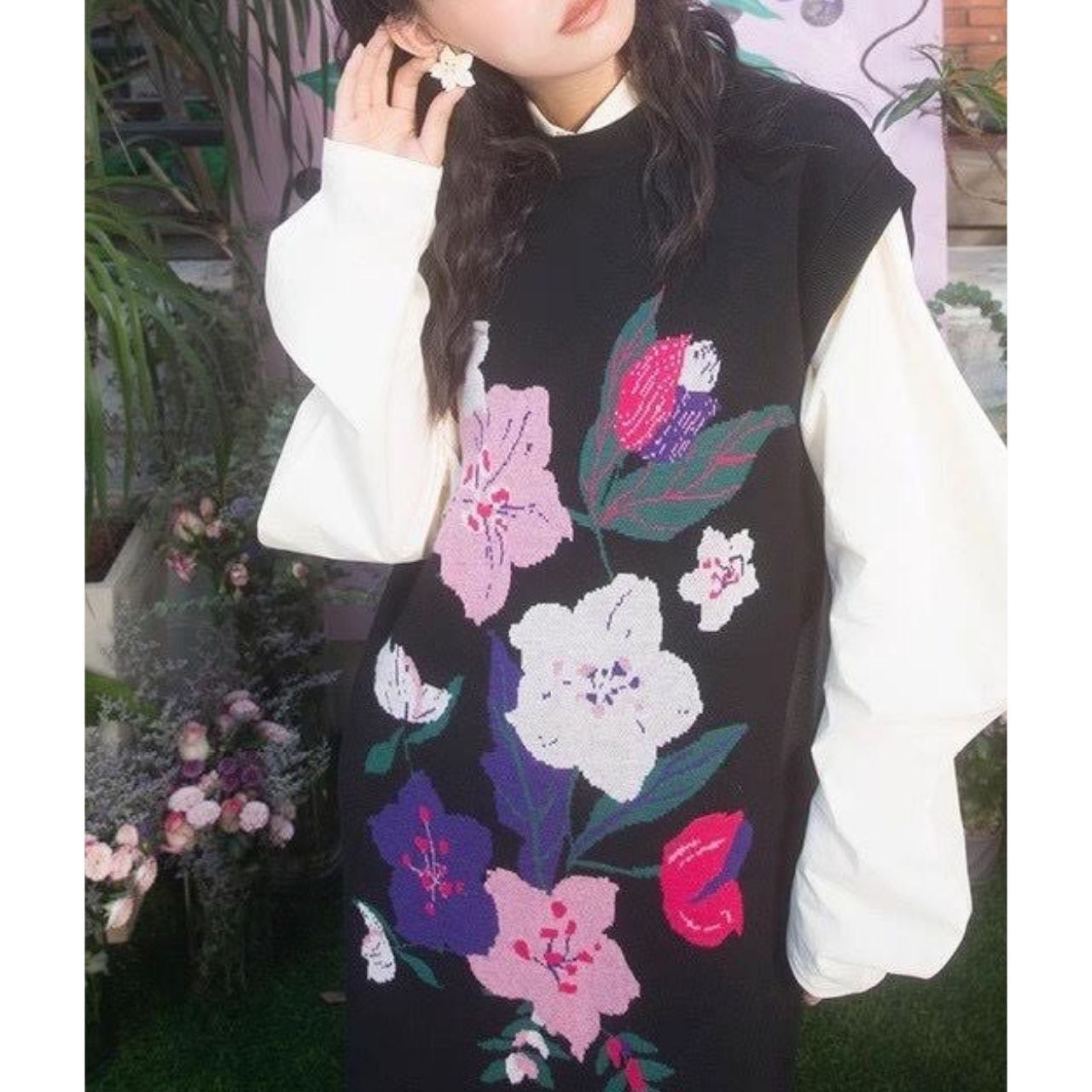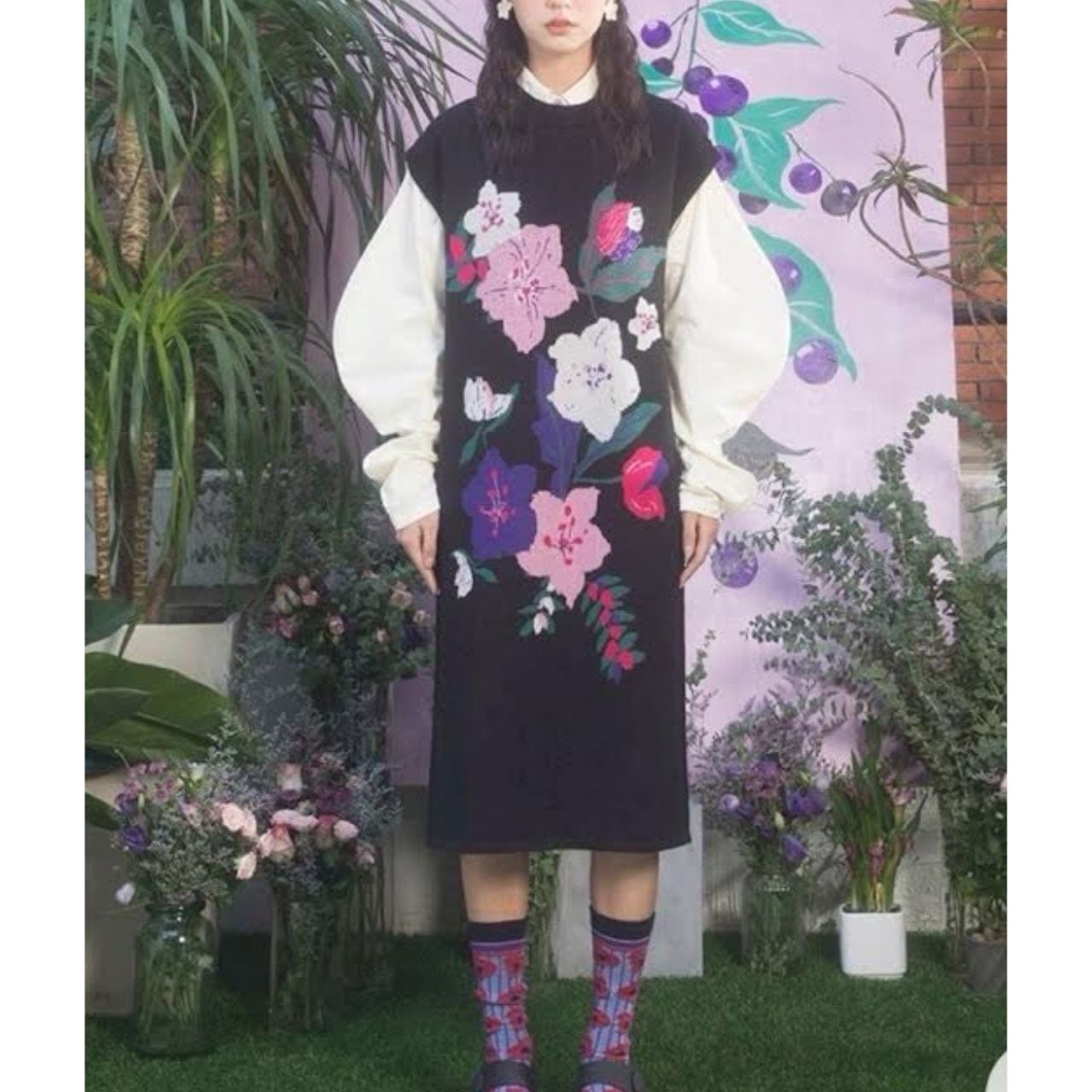 ブラックベースにピンク・パープル・グリーンの花柄刺繍が映える、