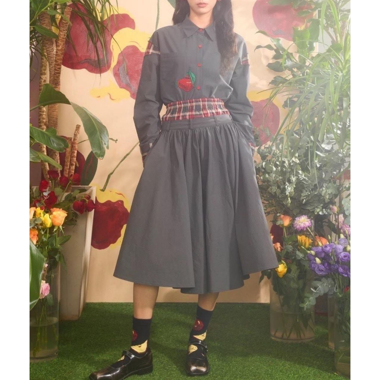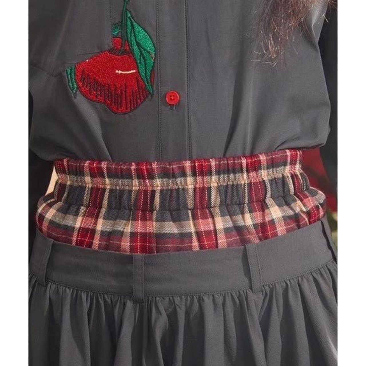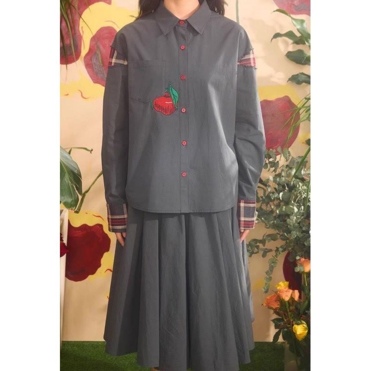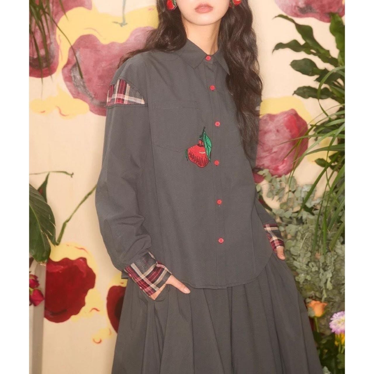 大人かわいい “りんご刺繍” とチェック柄の切り替えが目を惹く、