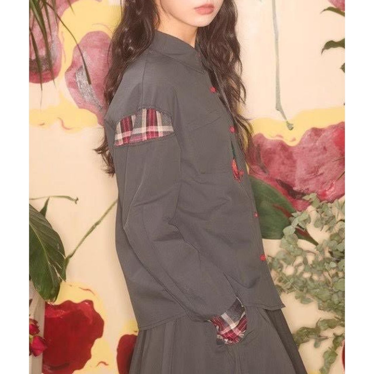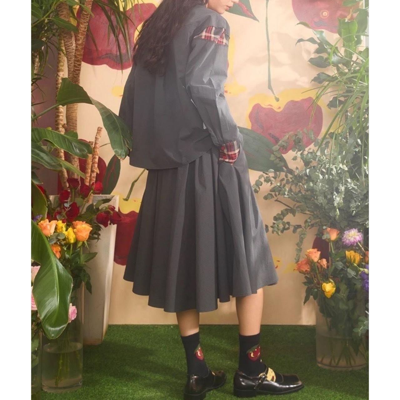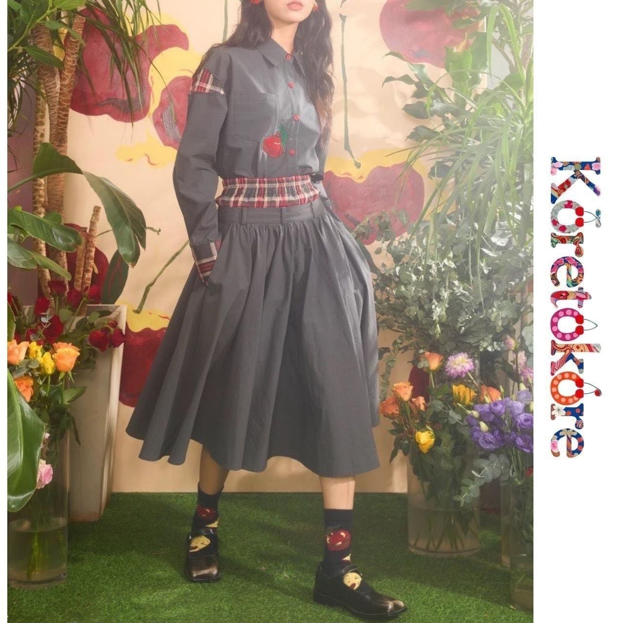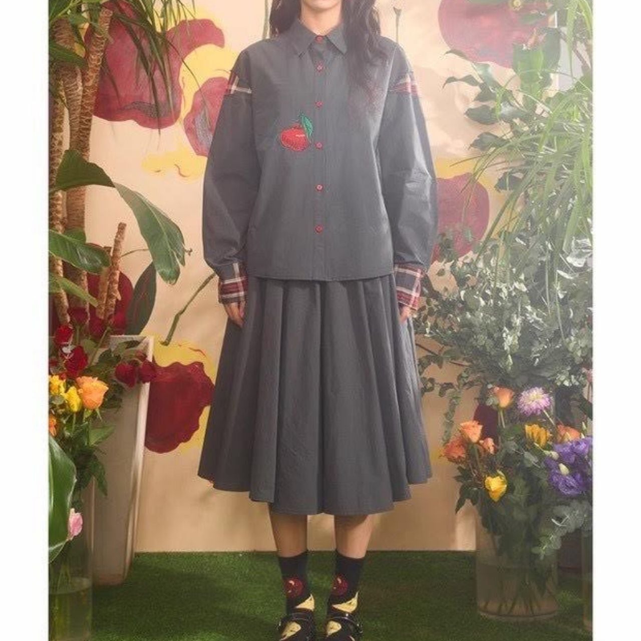 大人かわいい “りんご刺繍” とチェック柄の切り替えが目を惹く、