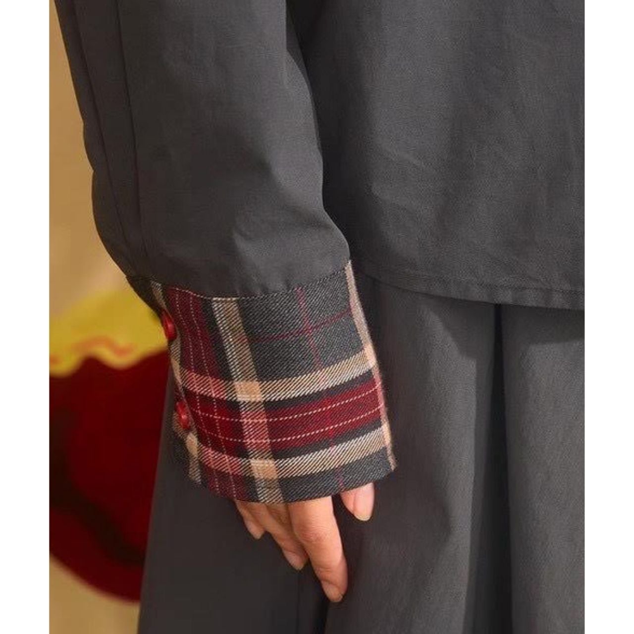 肩・袖口に施されたチェック切替が