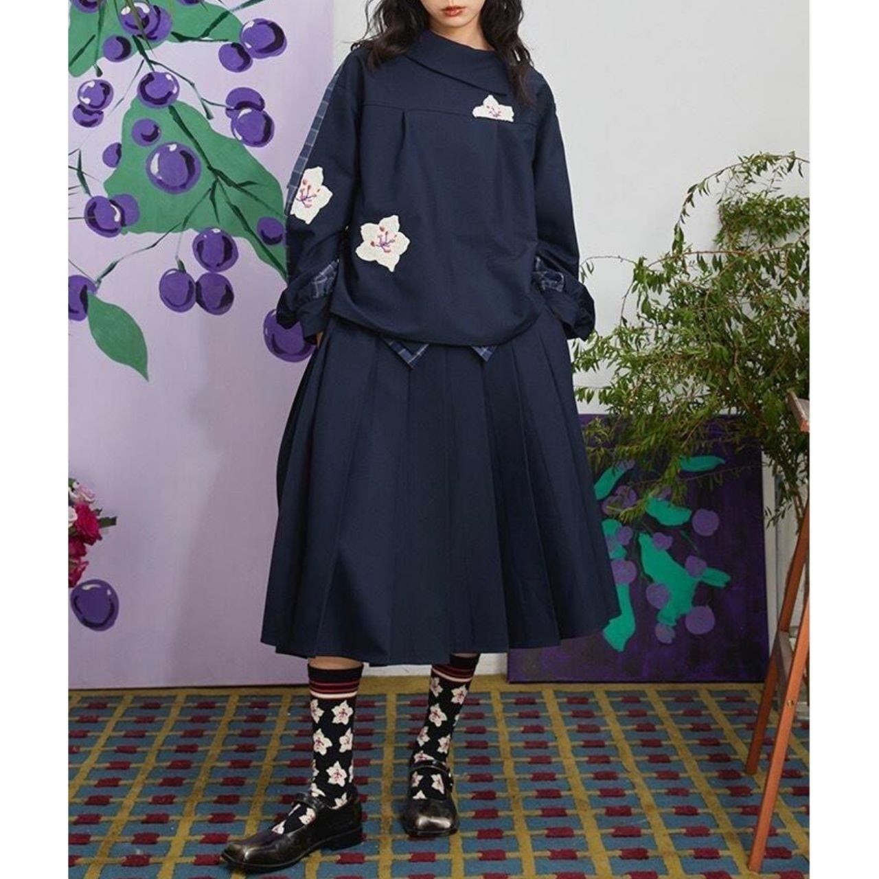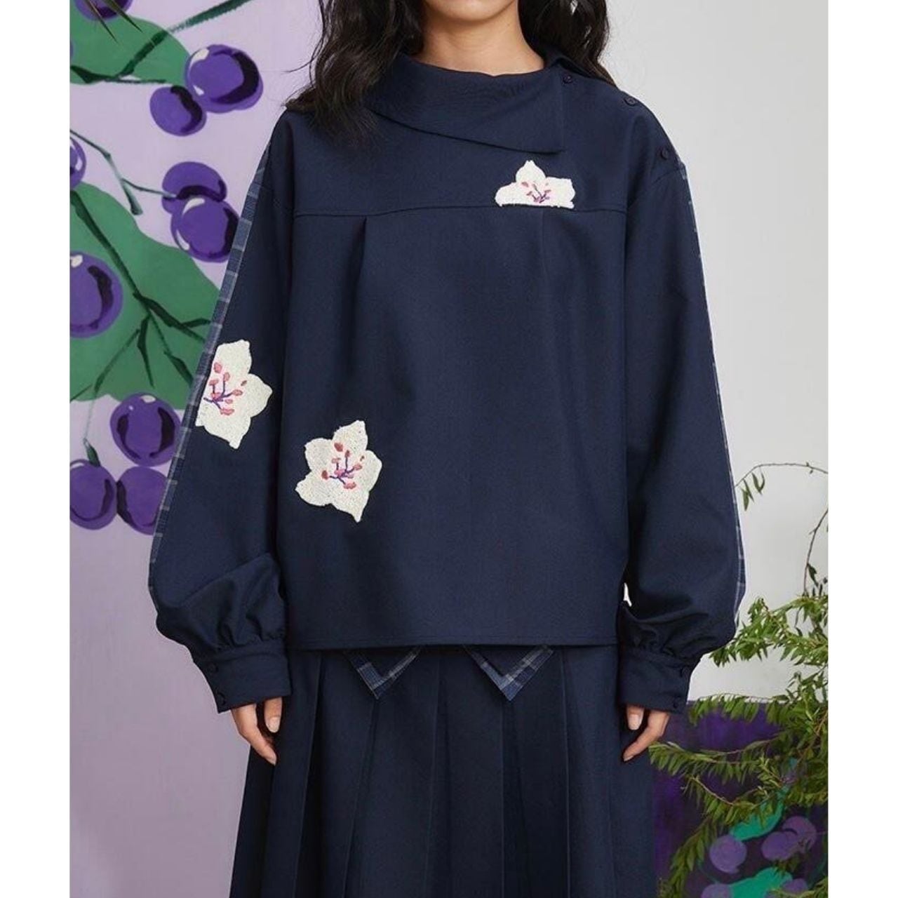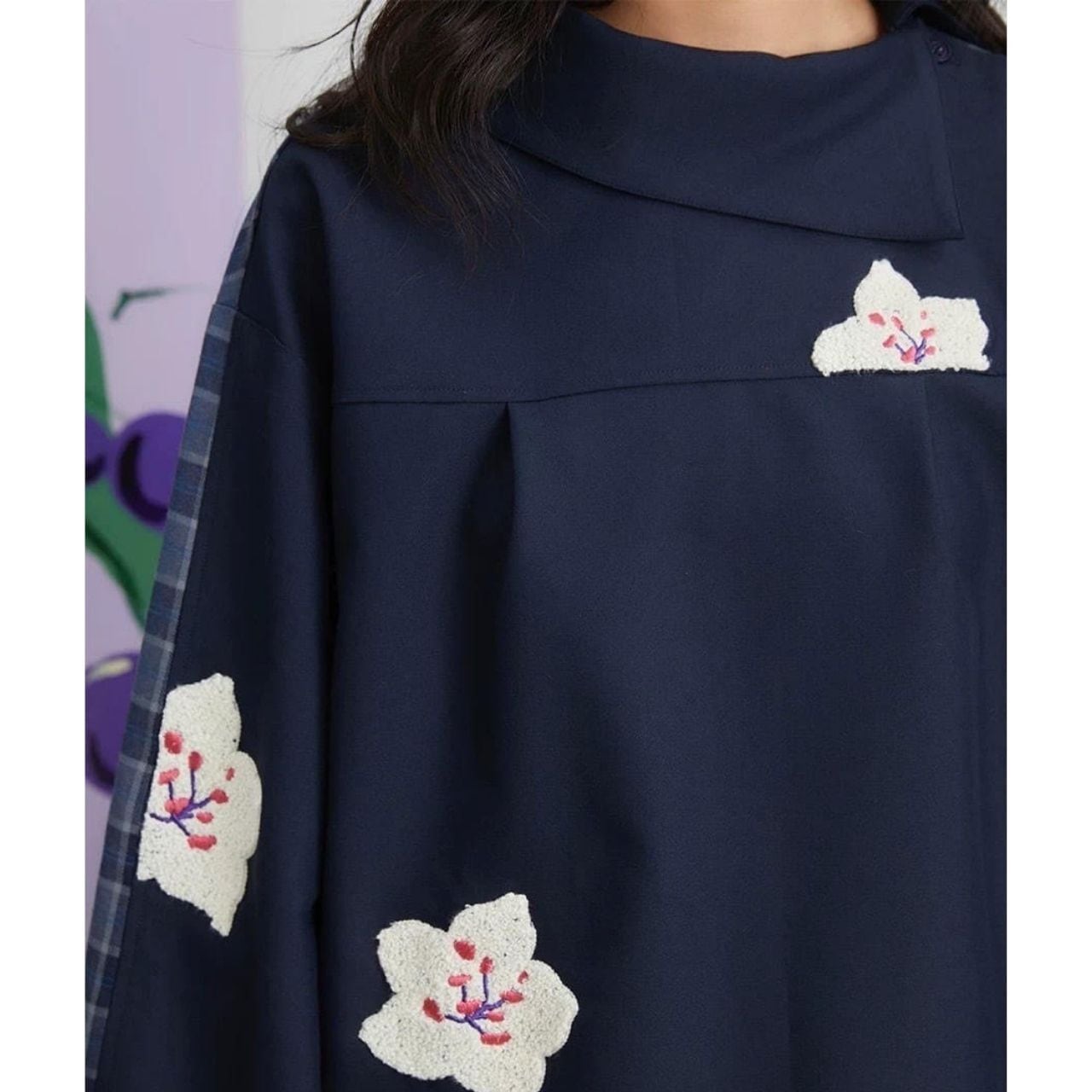トップスは肩・袖にかけてチェック×刺繍の組み合わせが施され、