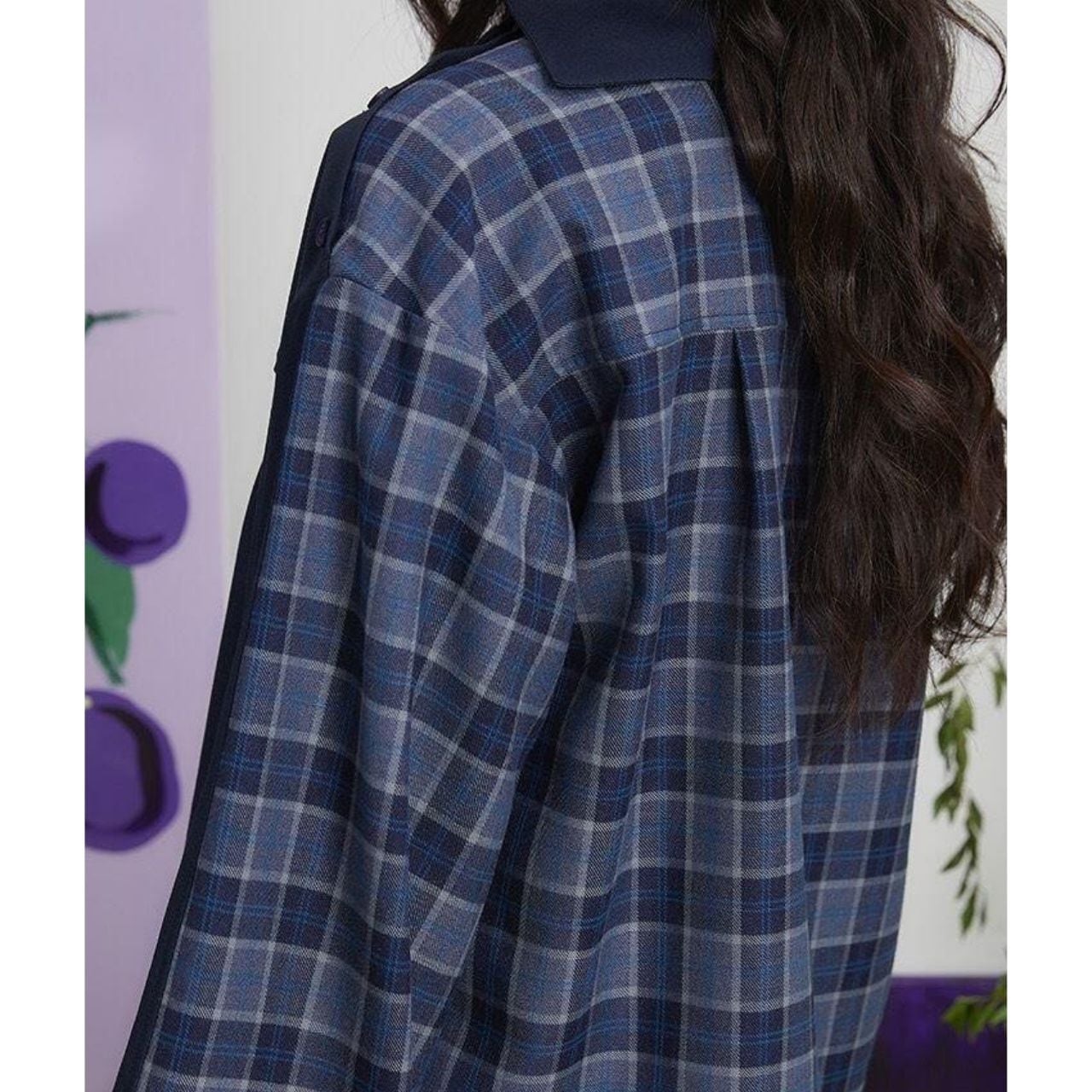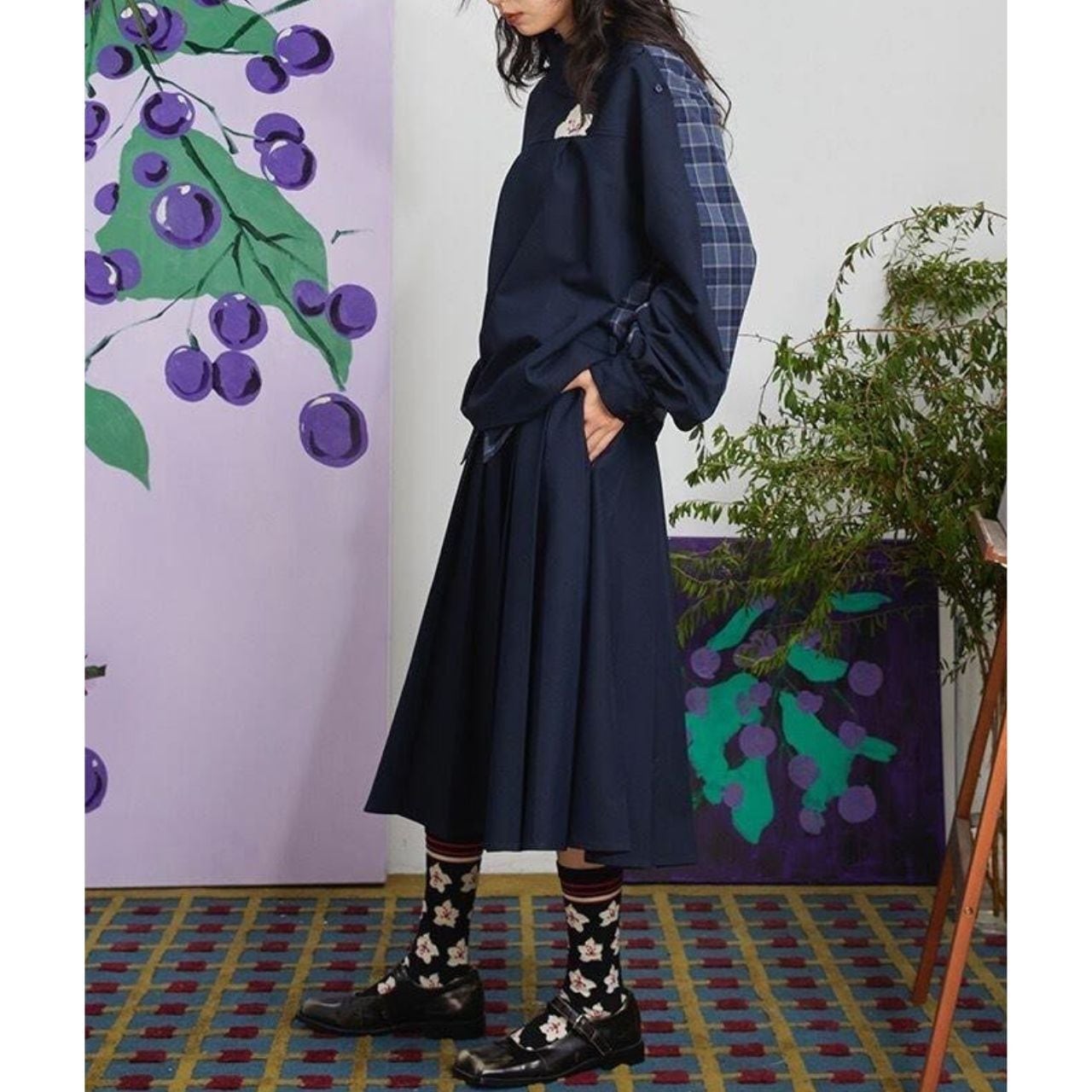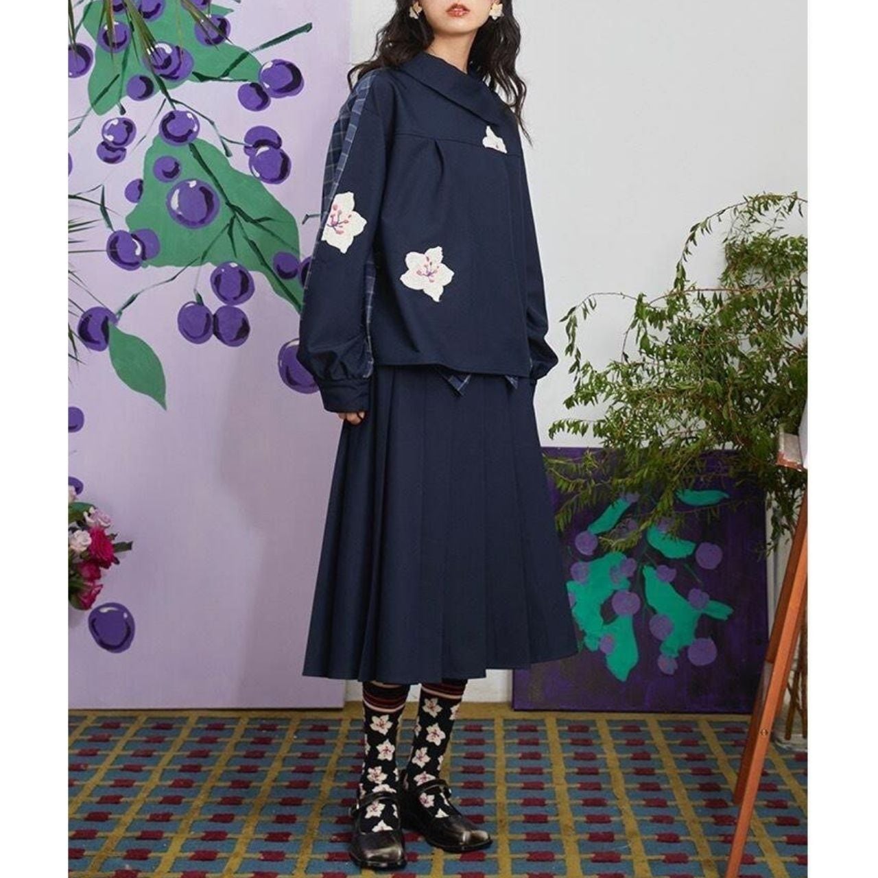 トップスは肩・袖にかけてチェック×刺繍の組み合わせが施され、