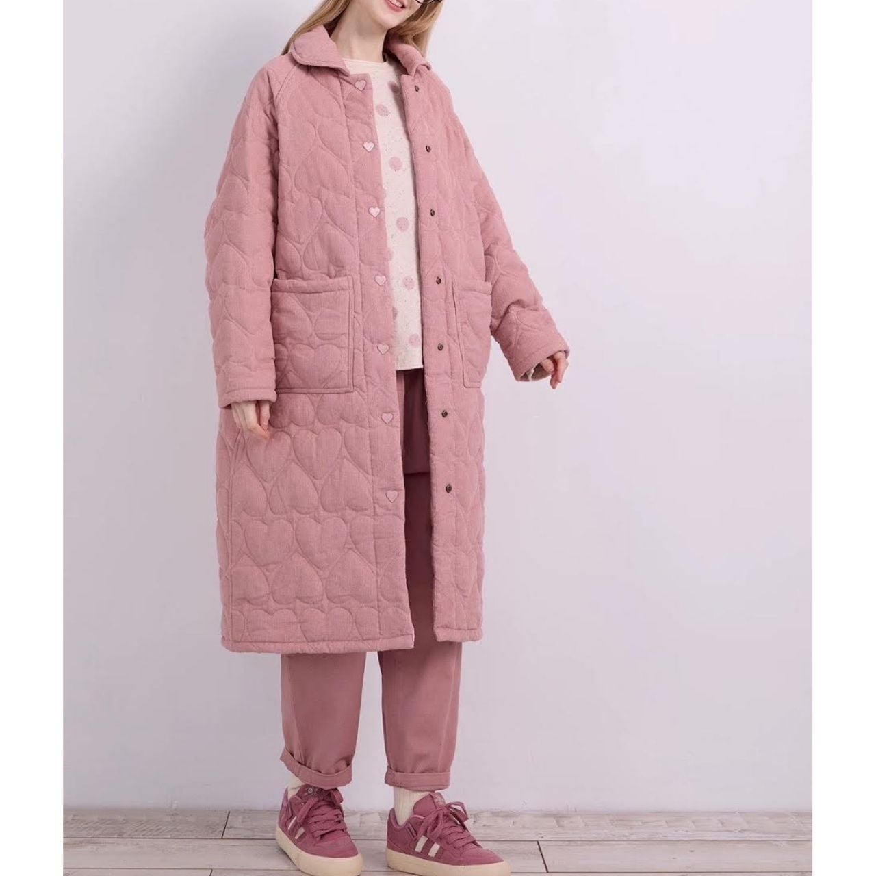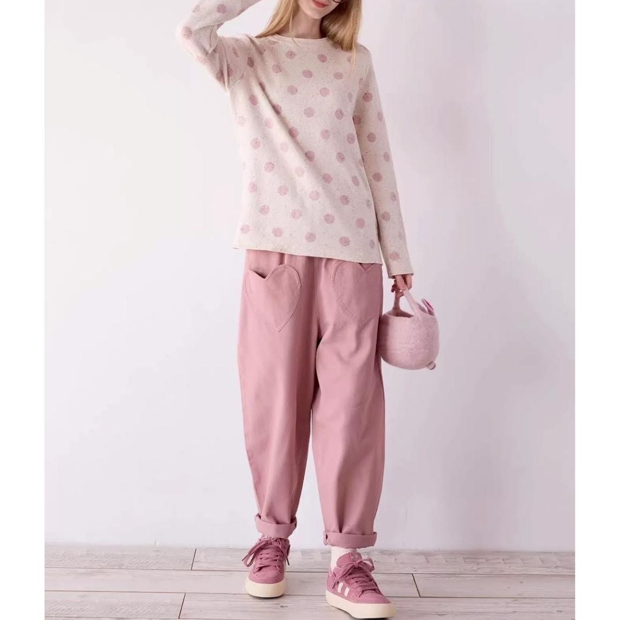 大人可愛いくすみピンクのコットンパンツ。