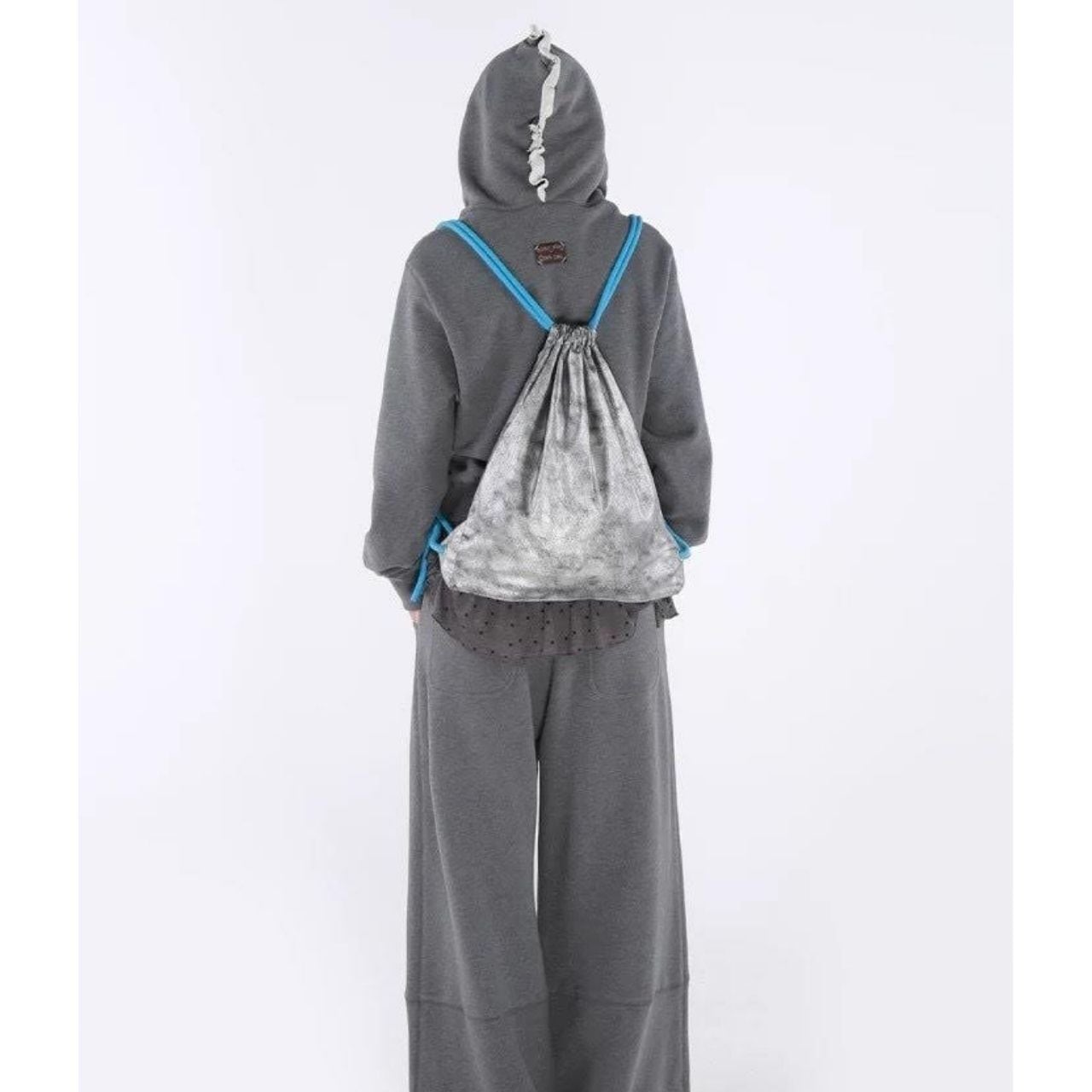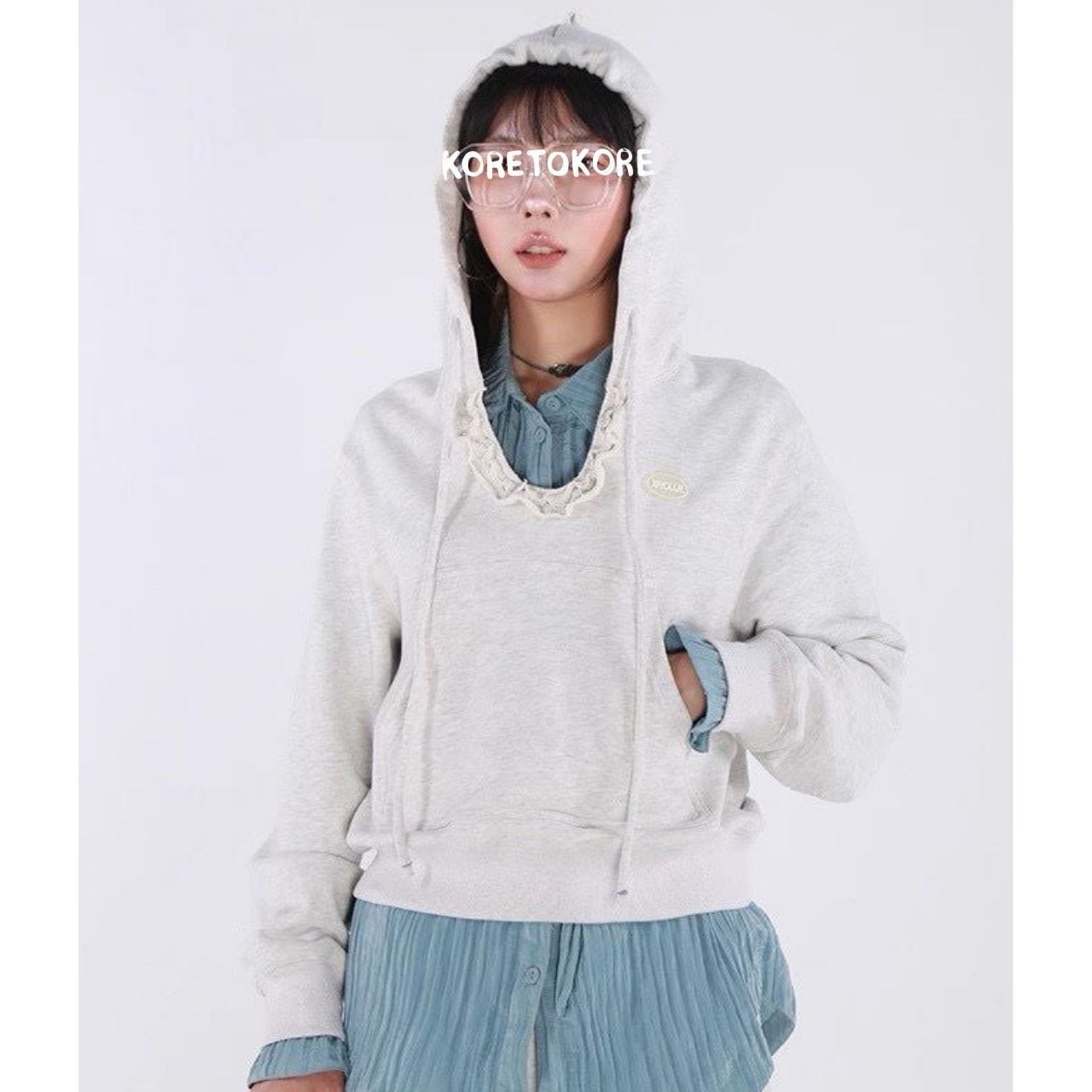フリルネックデザインが印象的なフード付きスウェット。