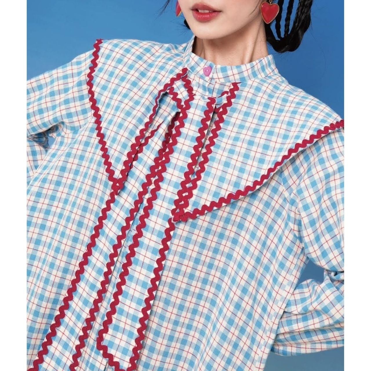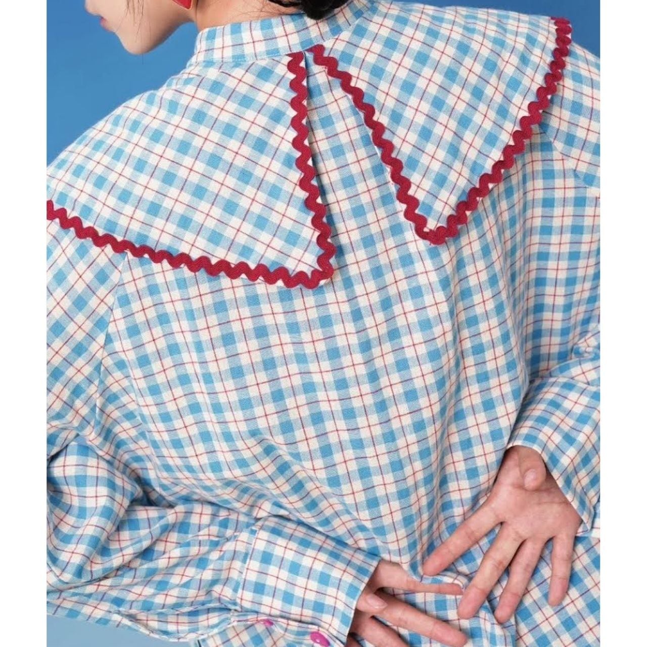 大きなセーラーカラーと配色パイピングが目を惹く、