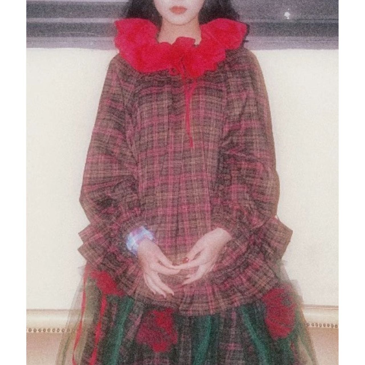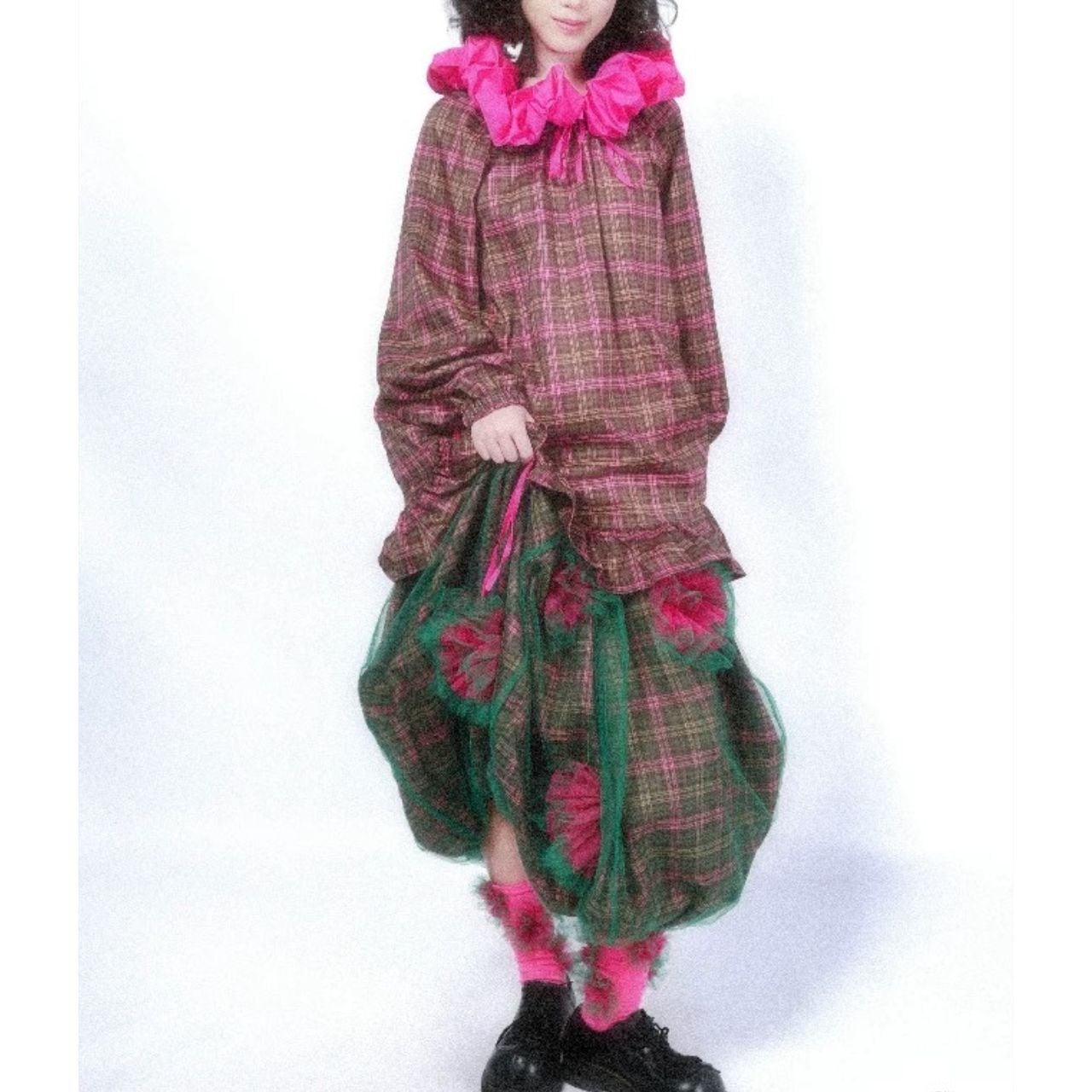大きなフリルカラーが目を引く、チェック柄トップス。