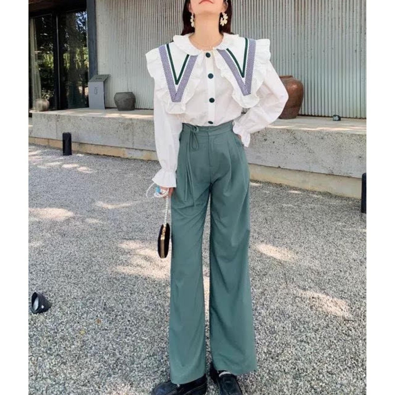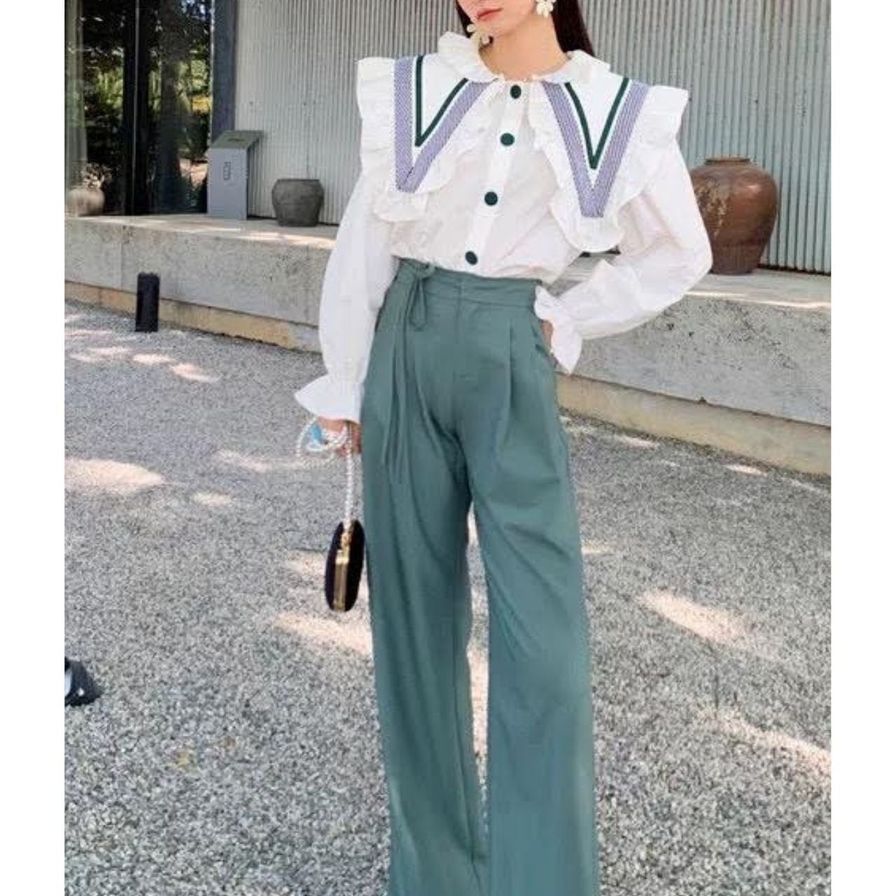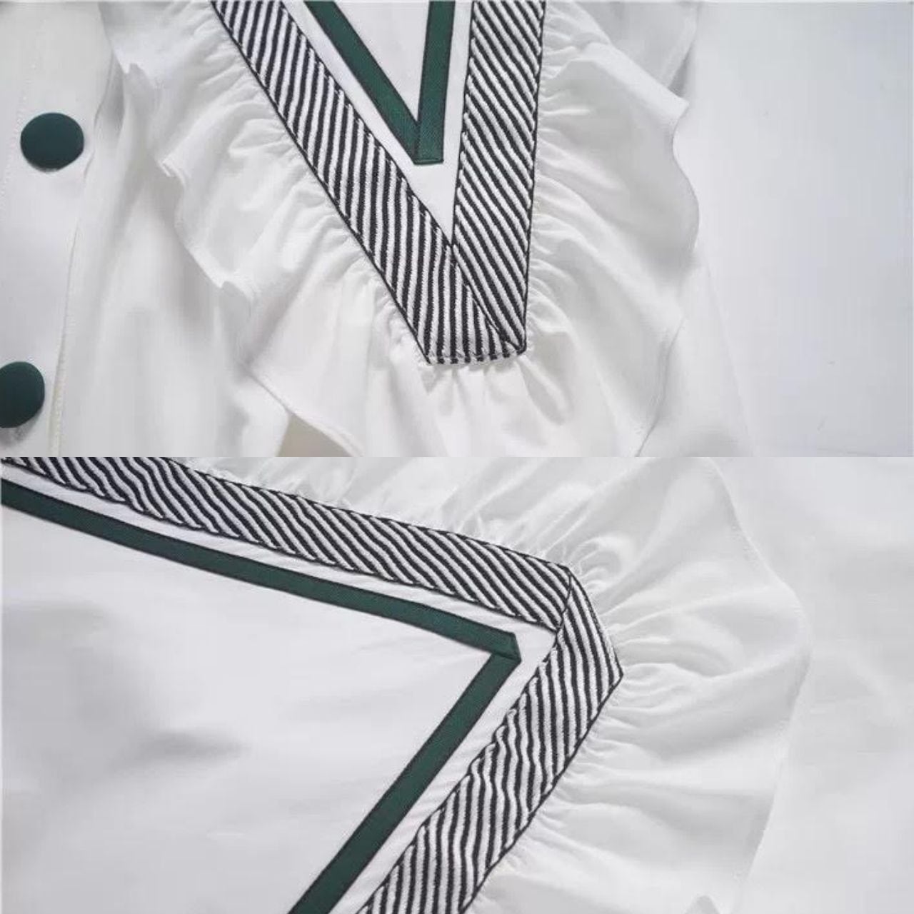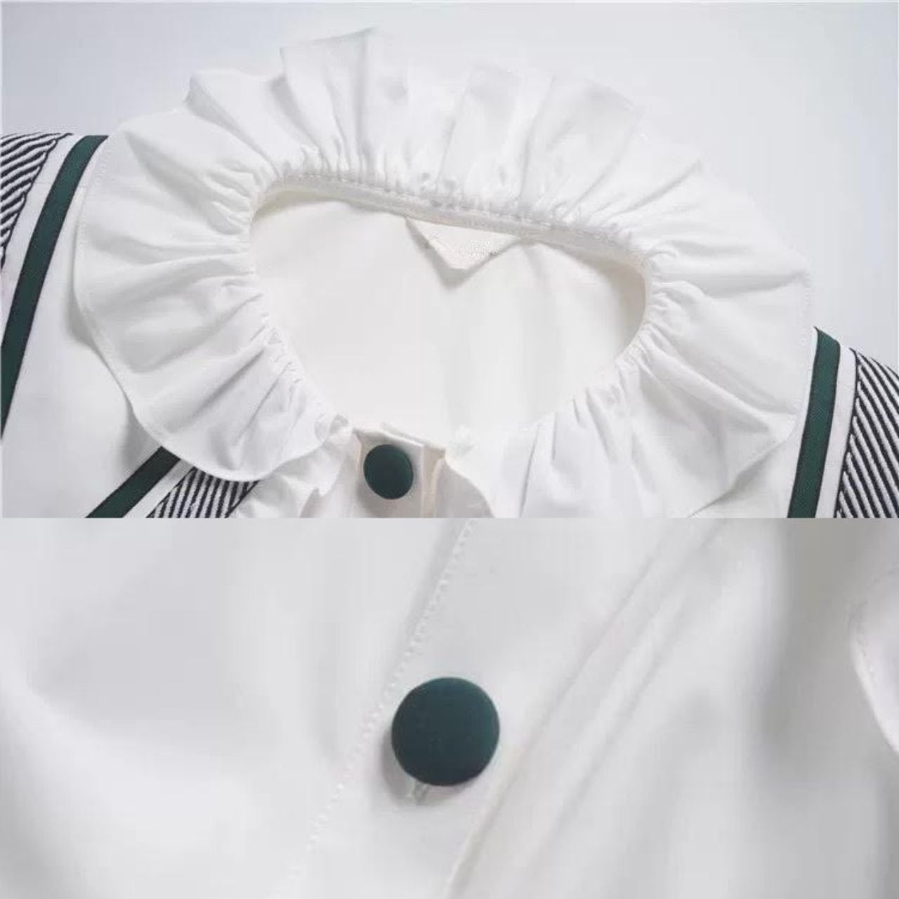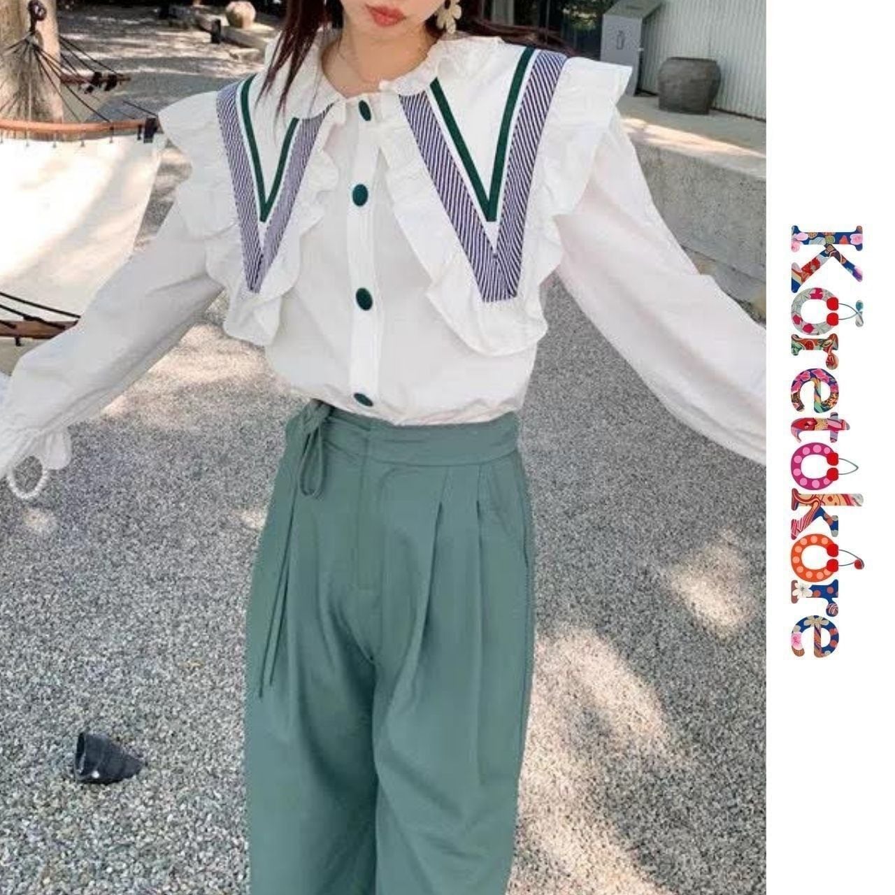 フリル付きの大きめ襟と配色ラインが、