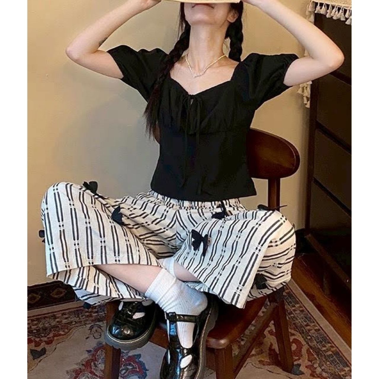 ちょこんと散りばめられたブラックリボン。