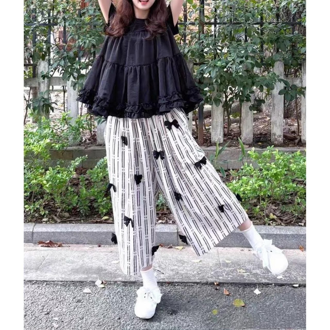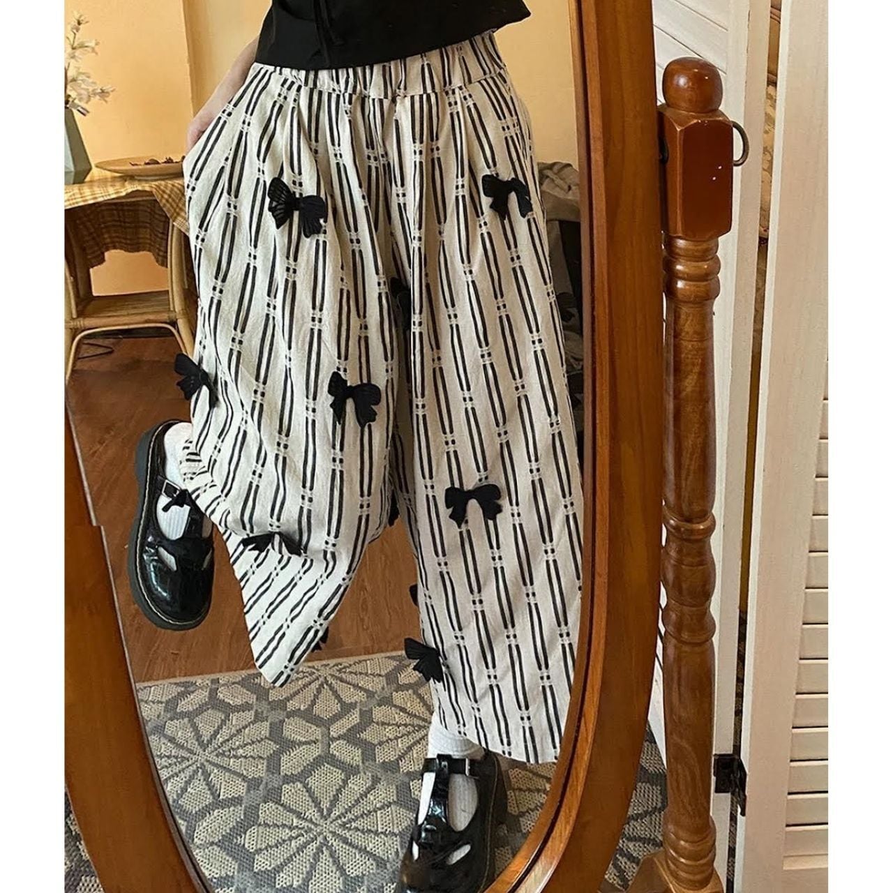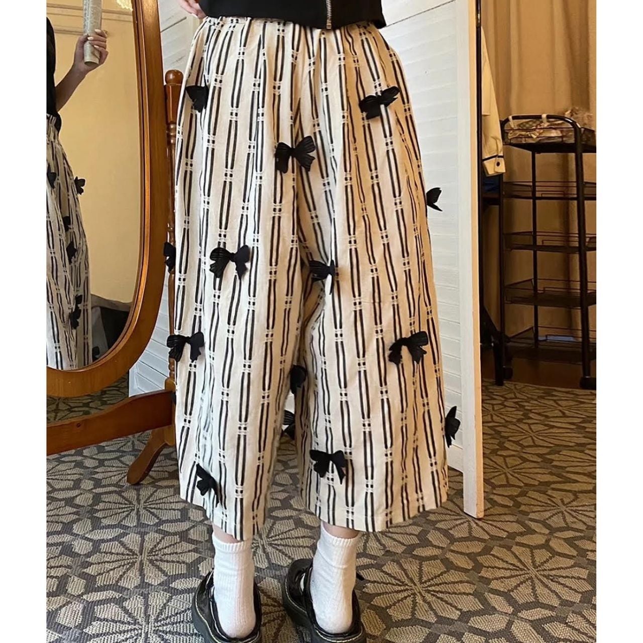 Mono Stripe Ribbon Wide Pants A1133