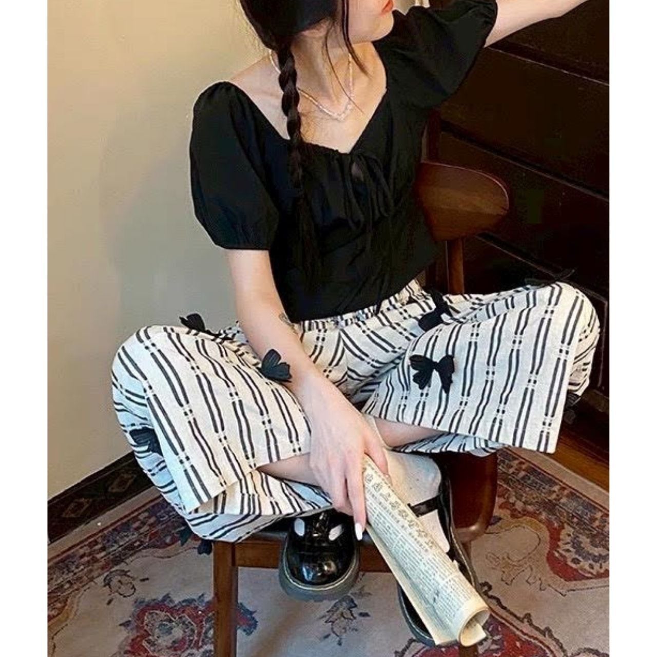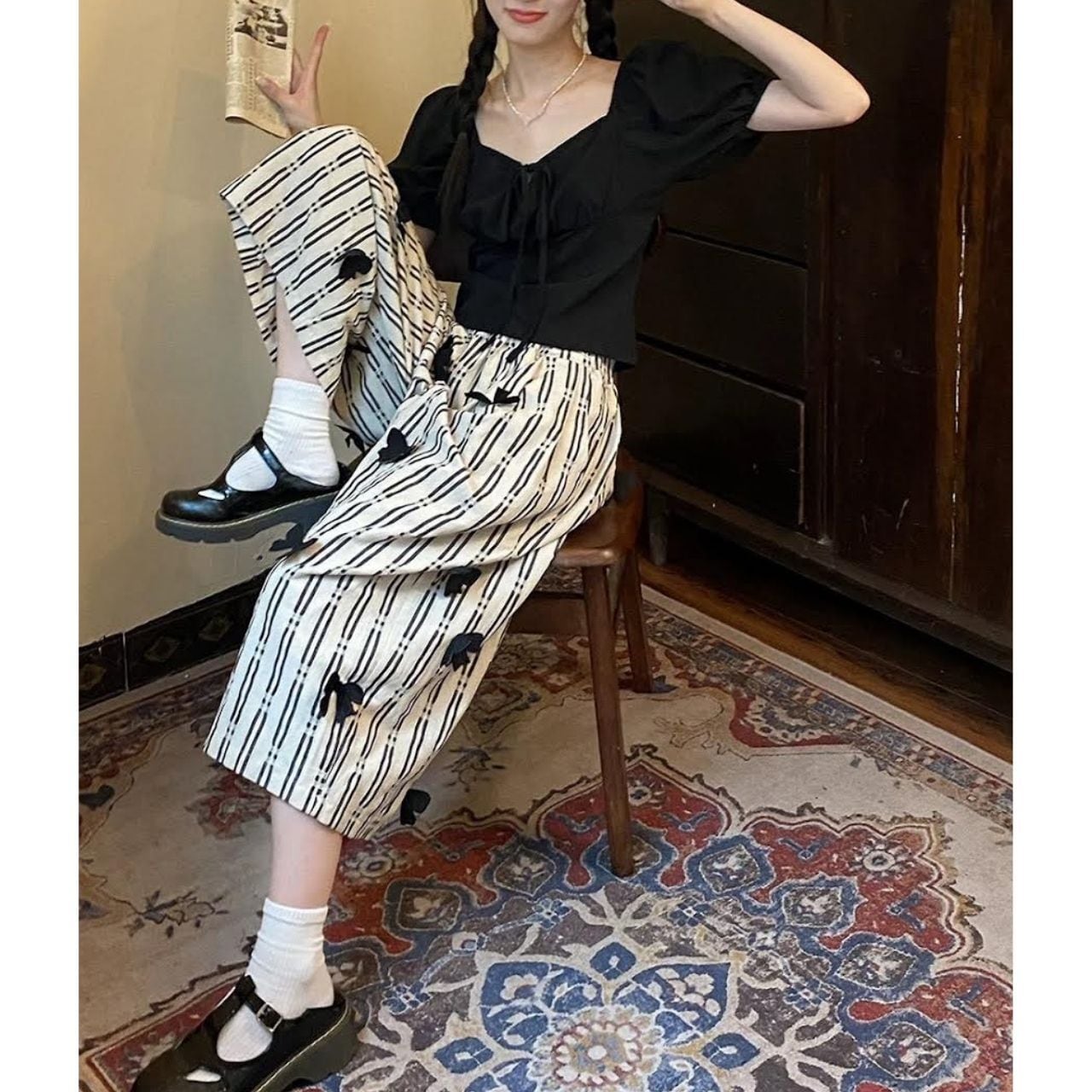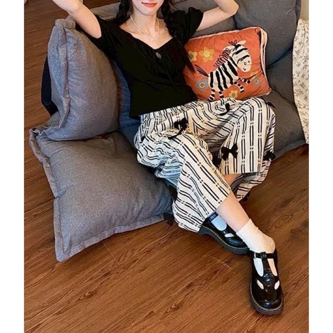 Mono Stripe Ribbon Wide Pants A1133