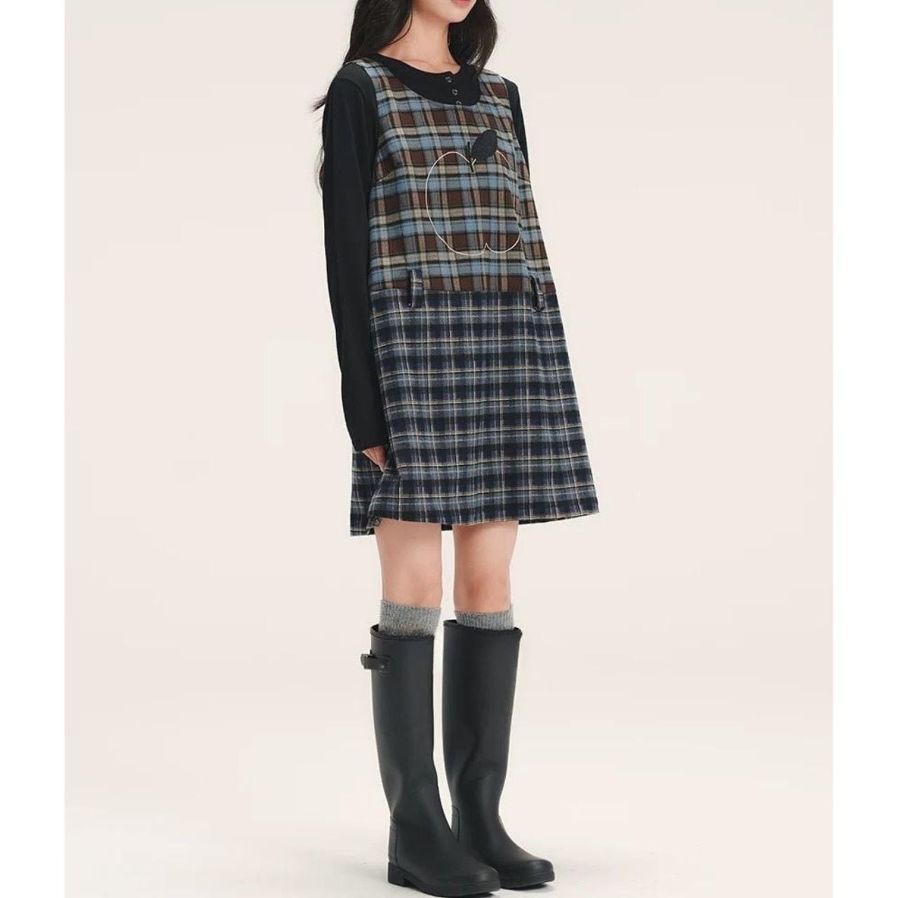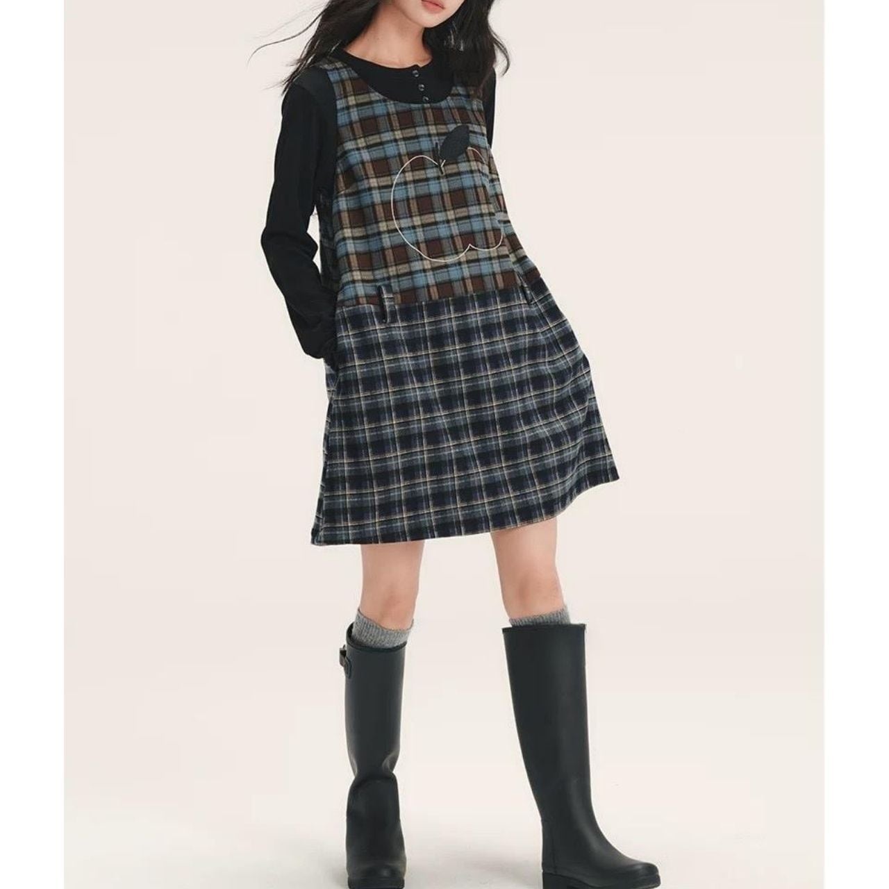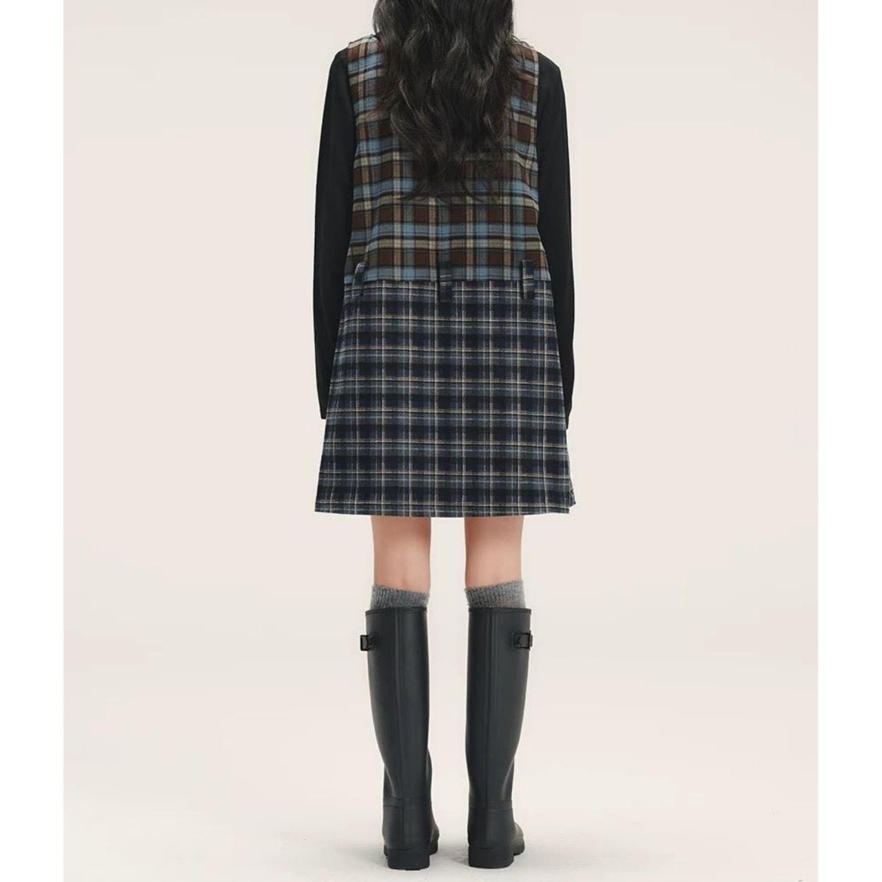 上身頃とスカート部分で異なるチェックを組み合わせ、