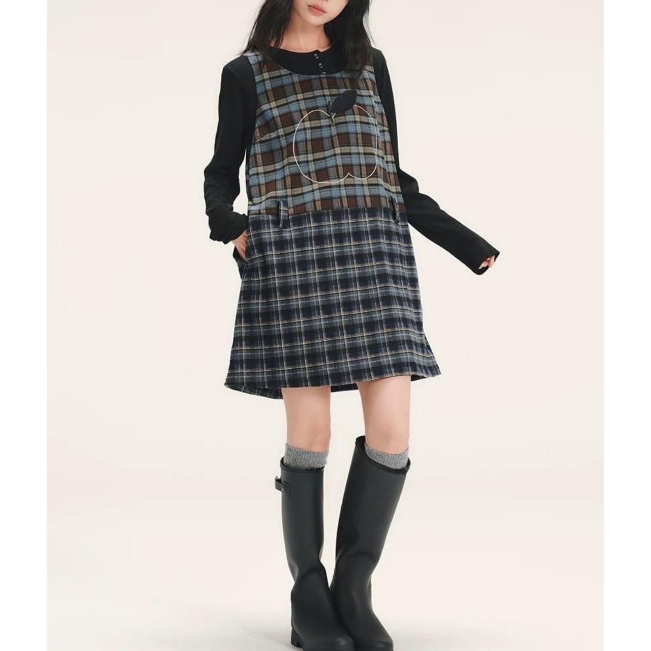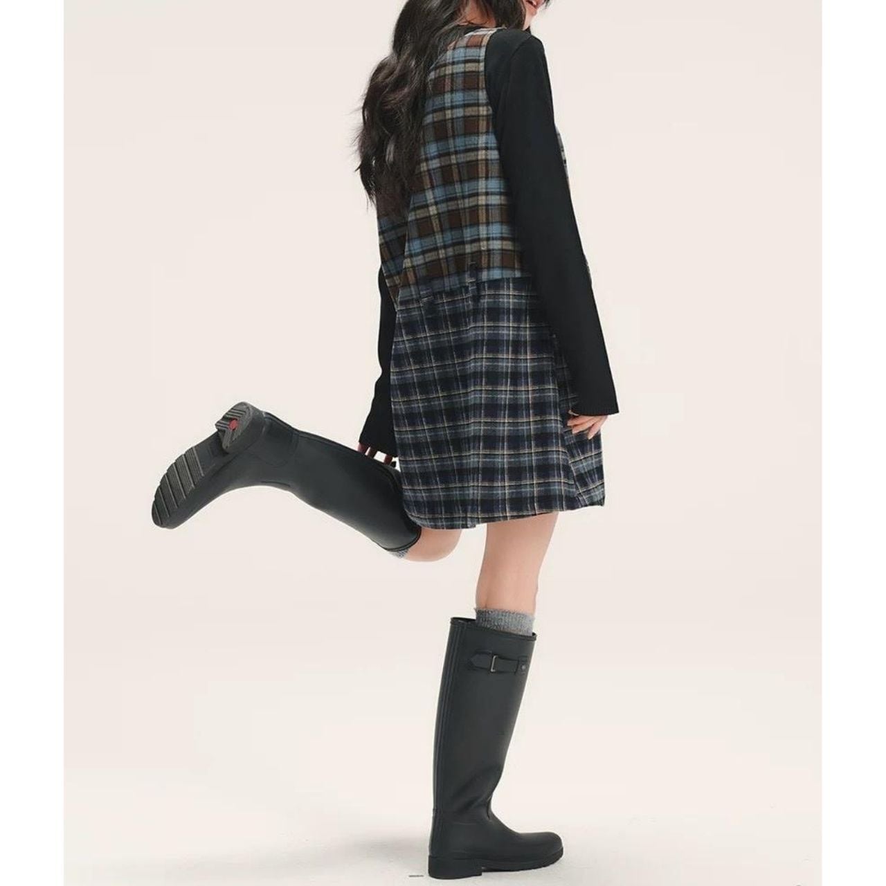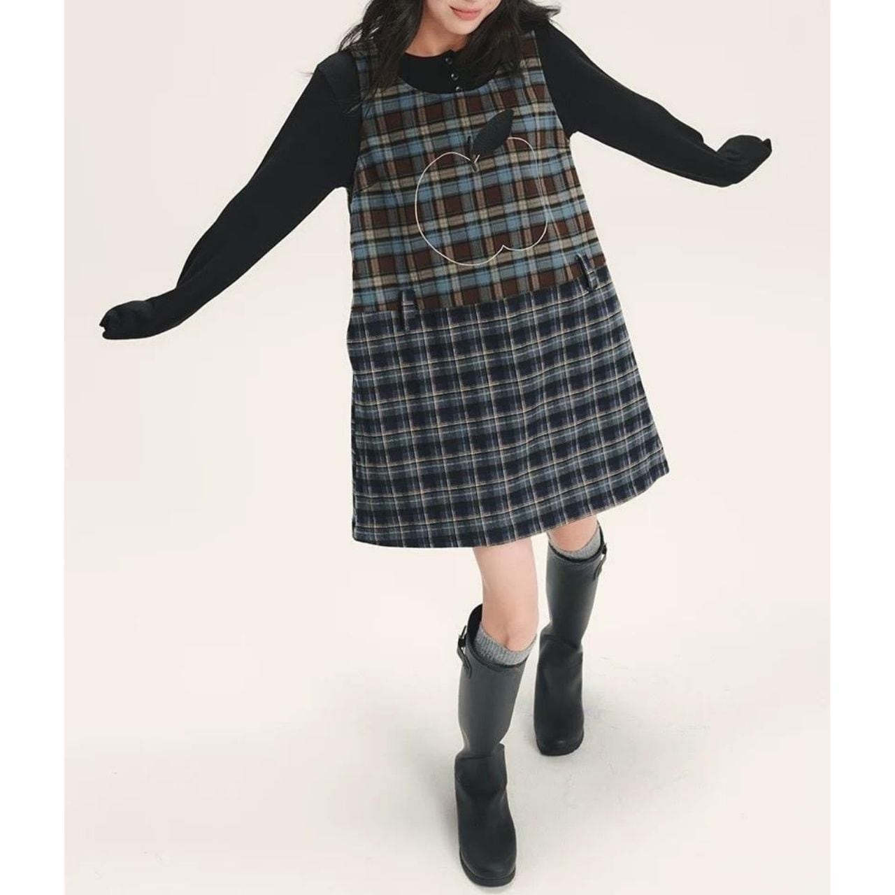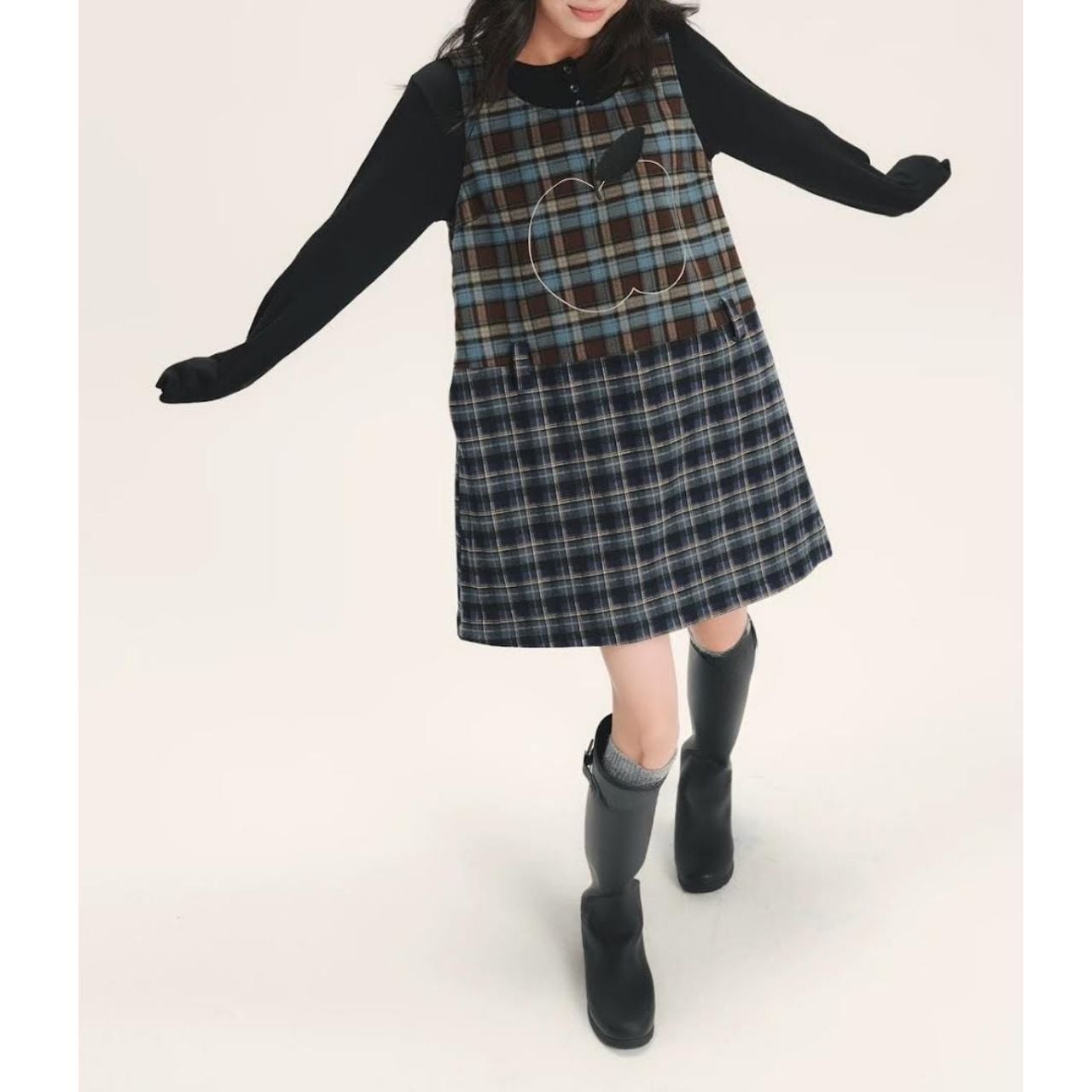 上身頃とスカート部分で異なるチェックを組み合わせ、