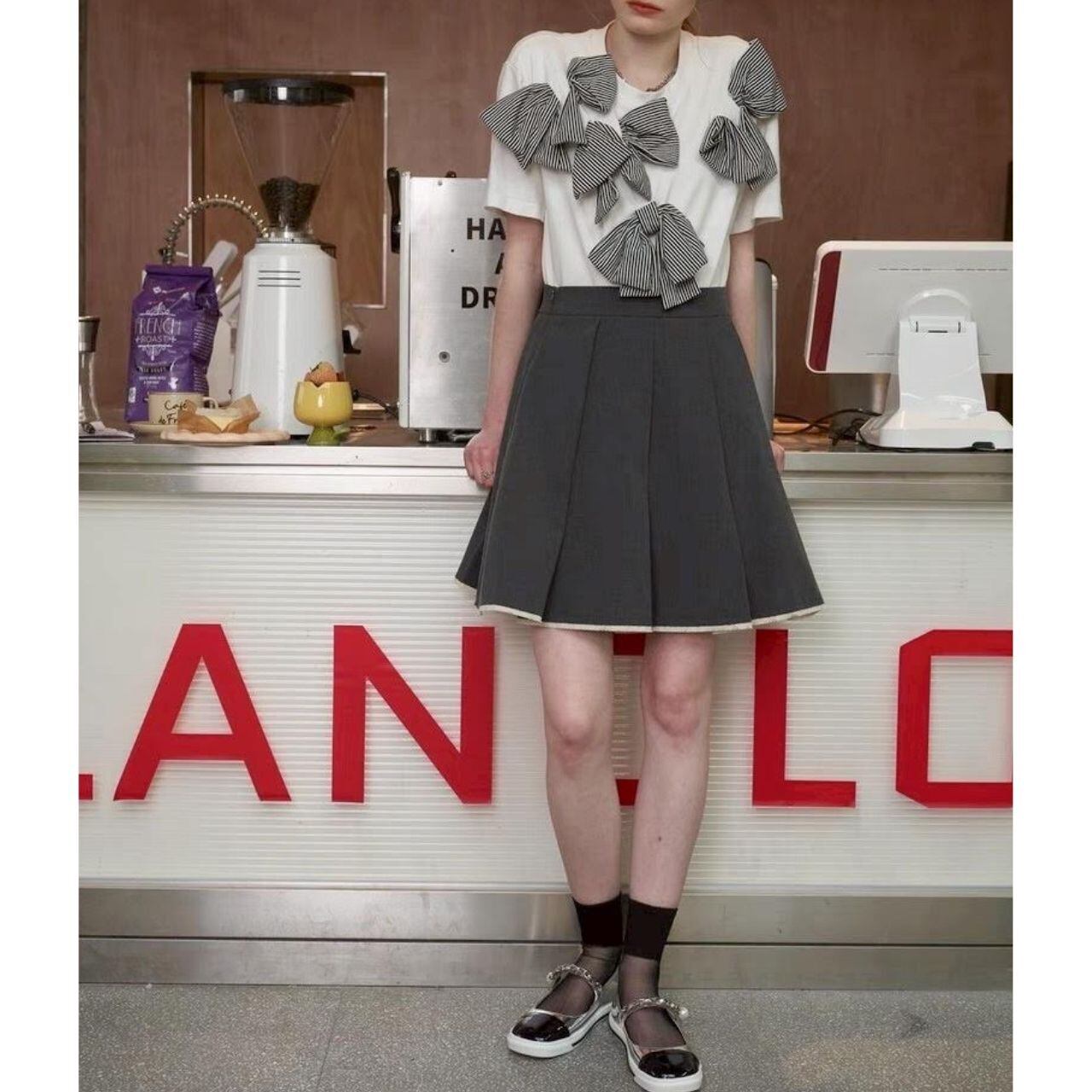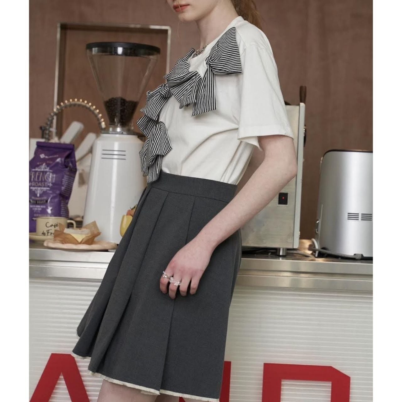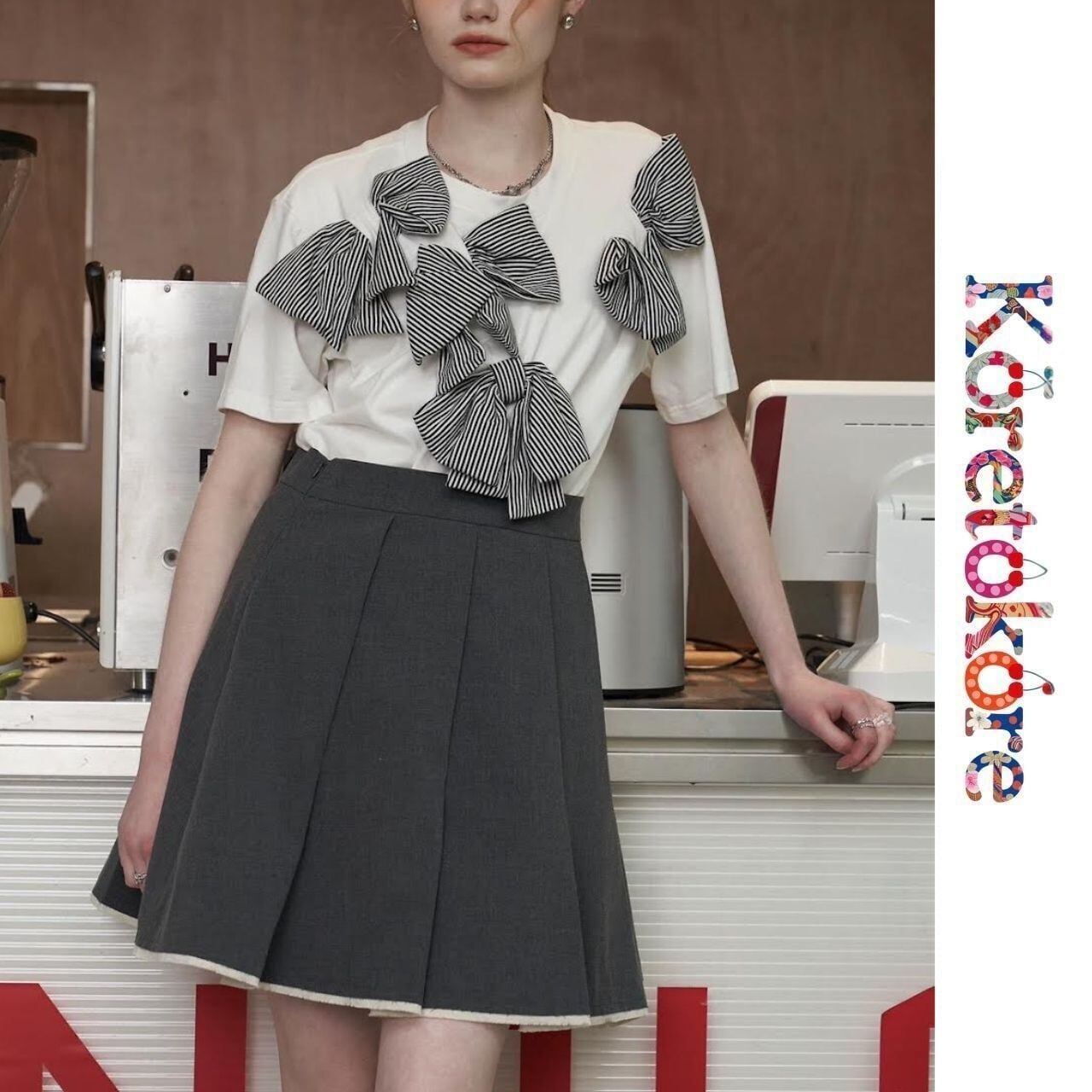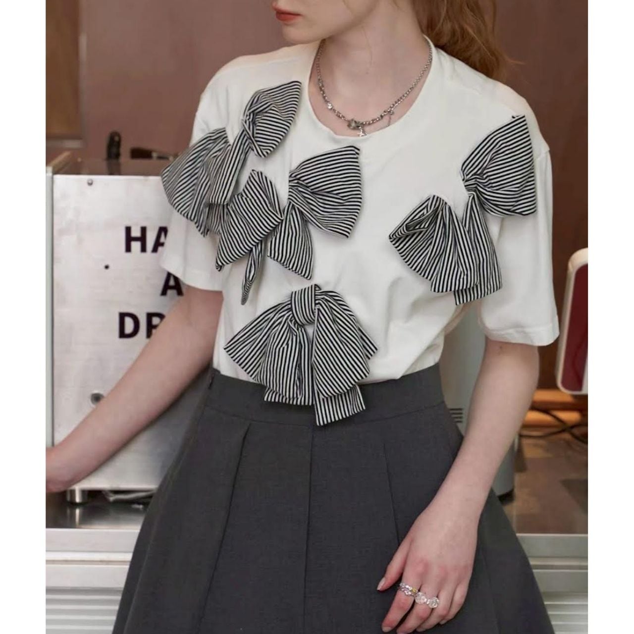 立体的なストライプリボンが印象的なデザインTシャツ。