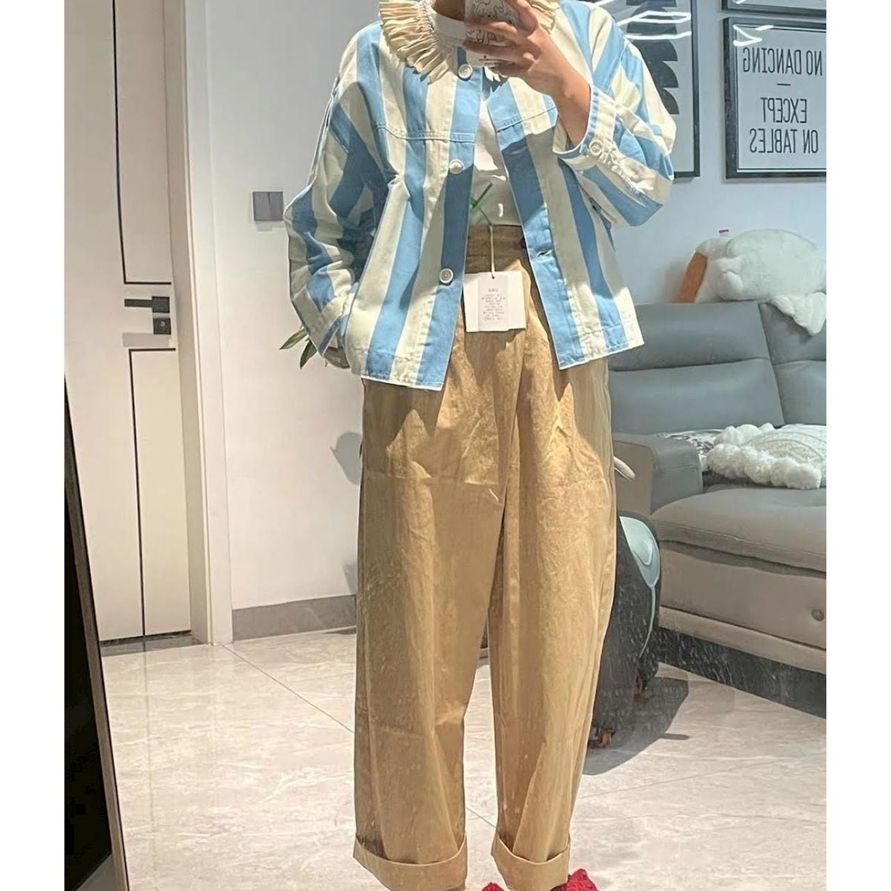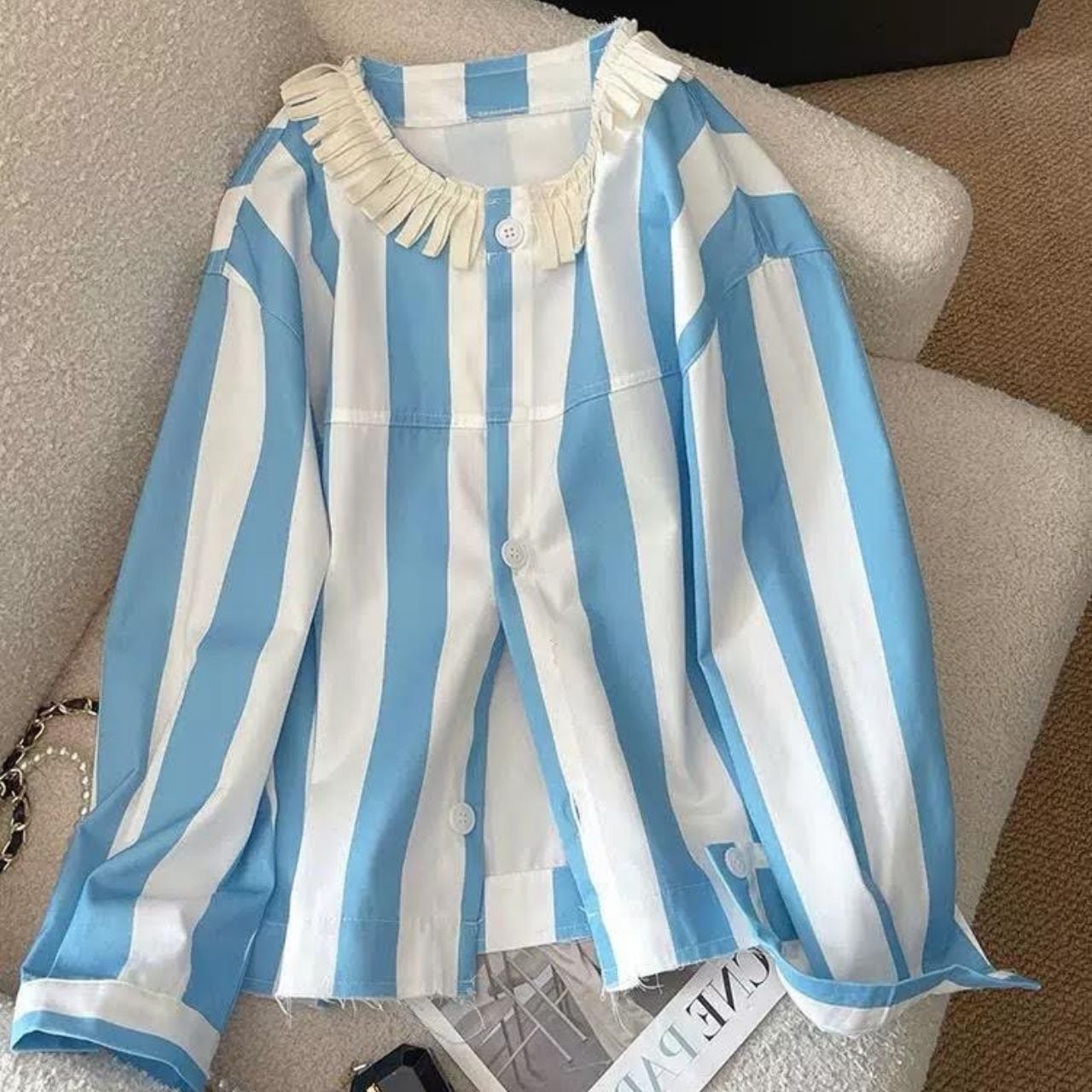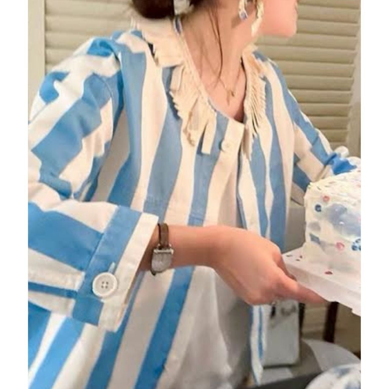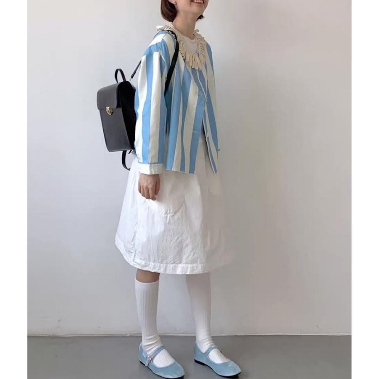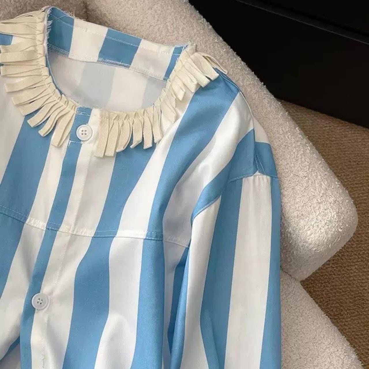 首元のフリルディテールがさりげないポイント。