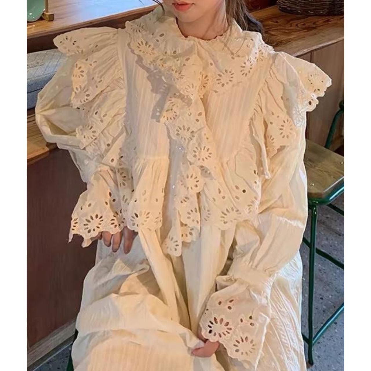 たっぷりとしたフリルデザインが顔まわりを華やかにし、