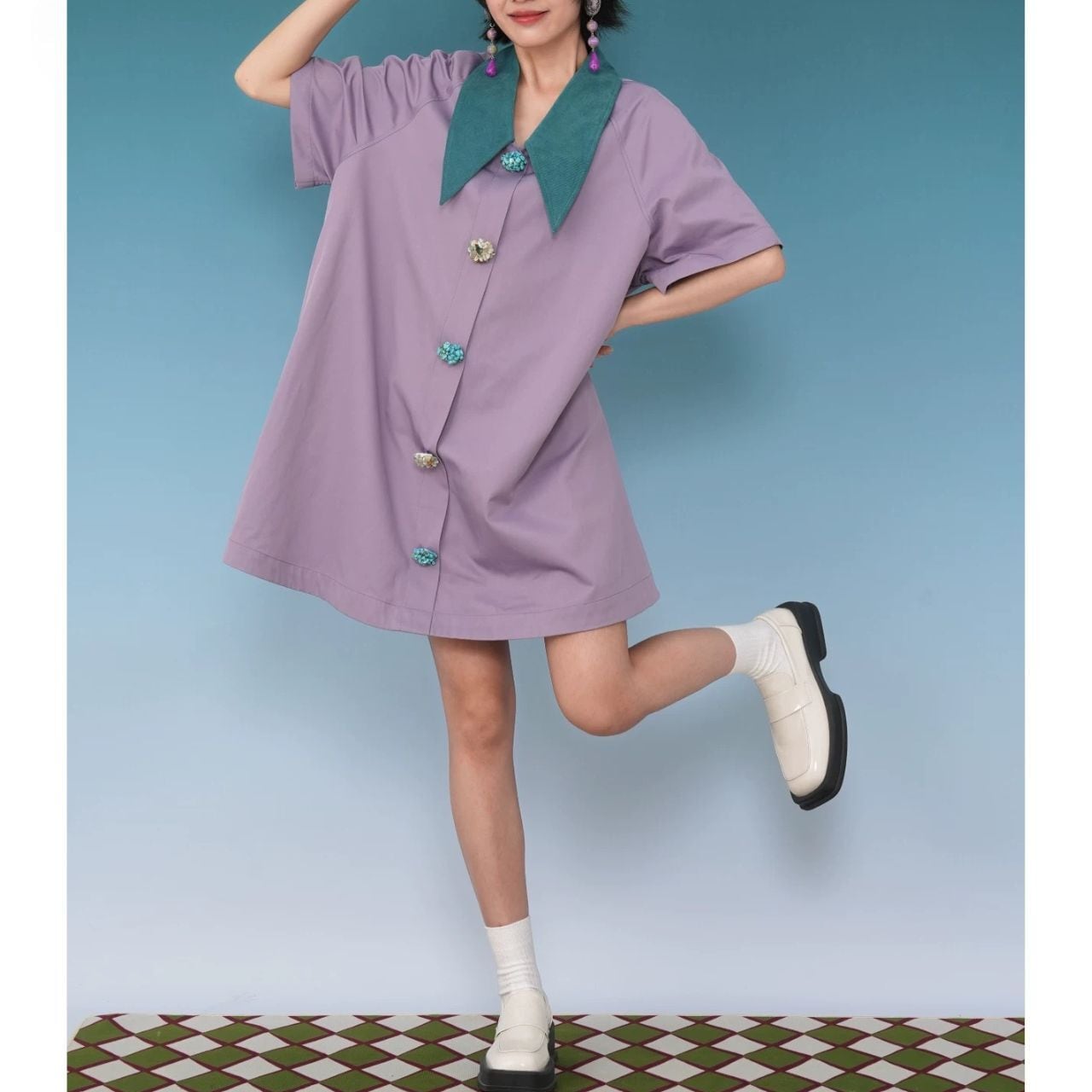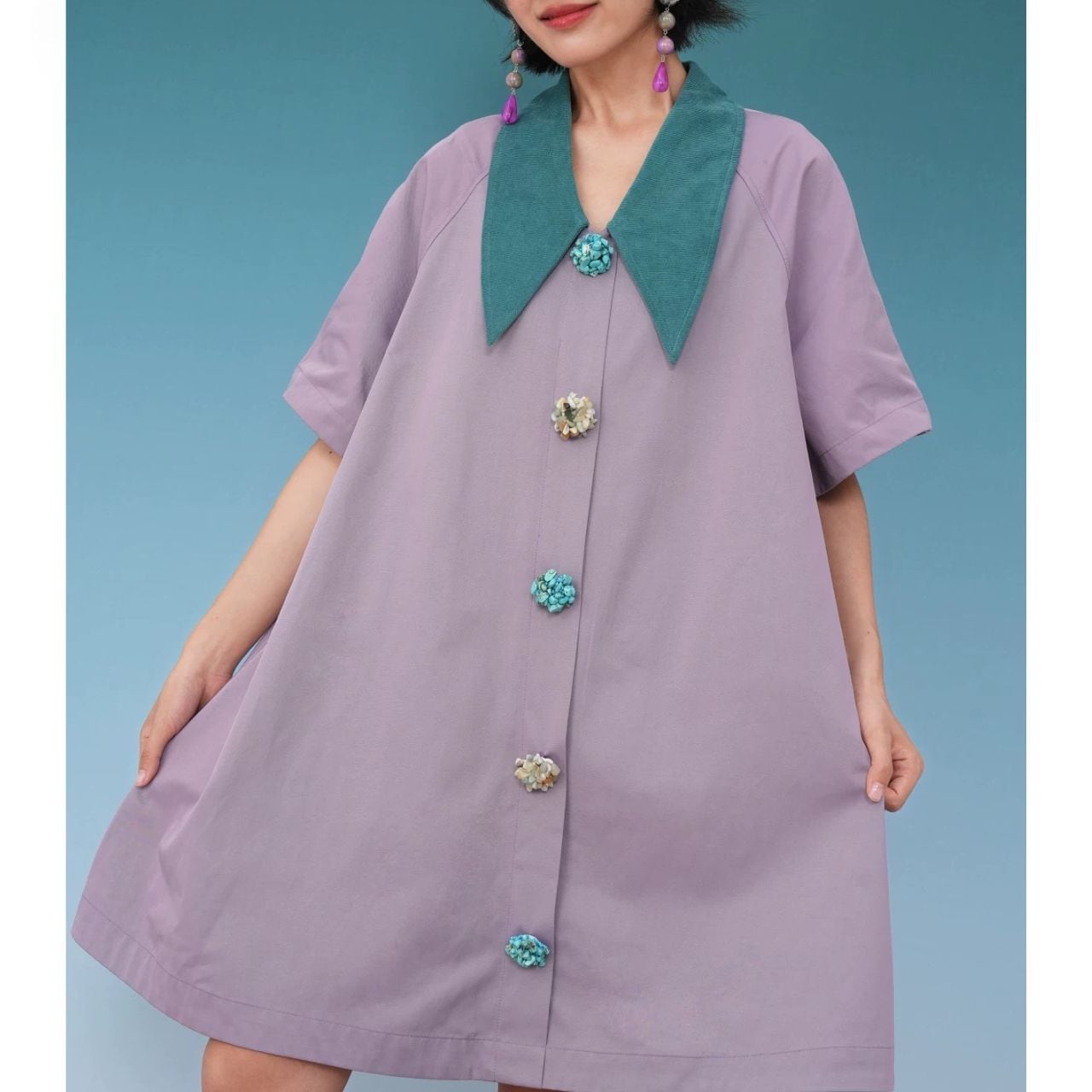 Stone Button Color Collar Dress A1179