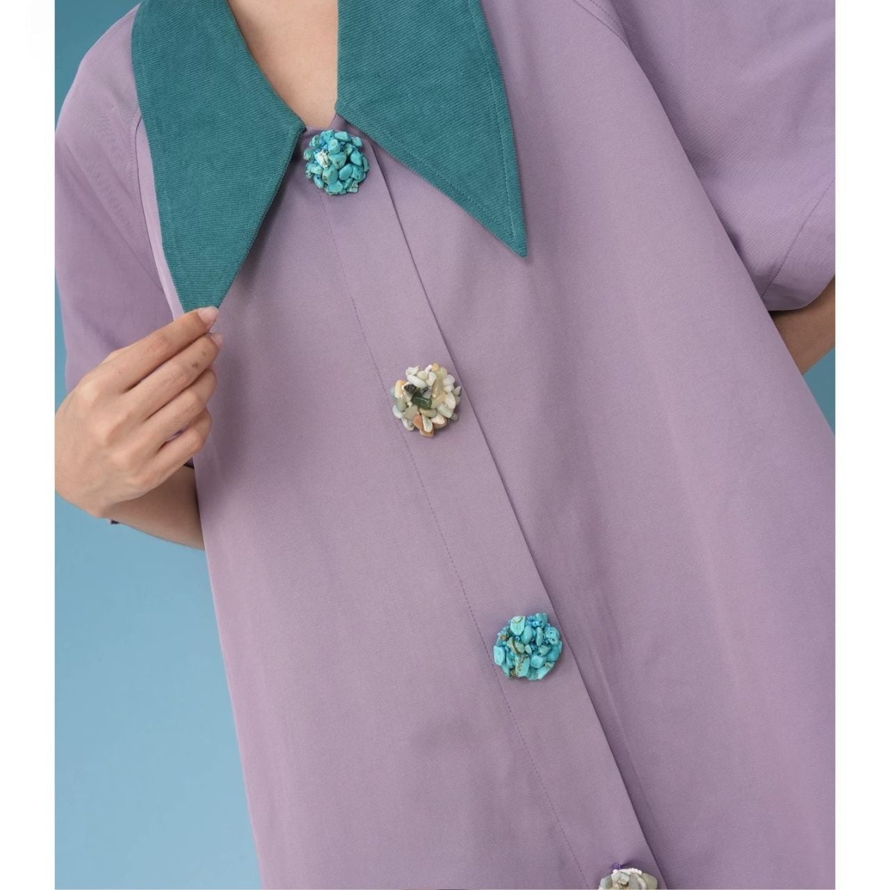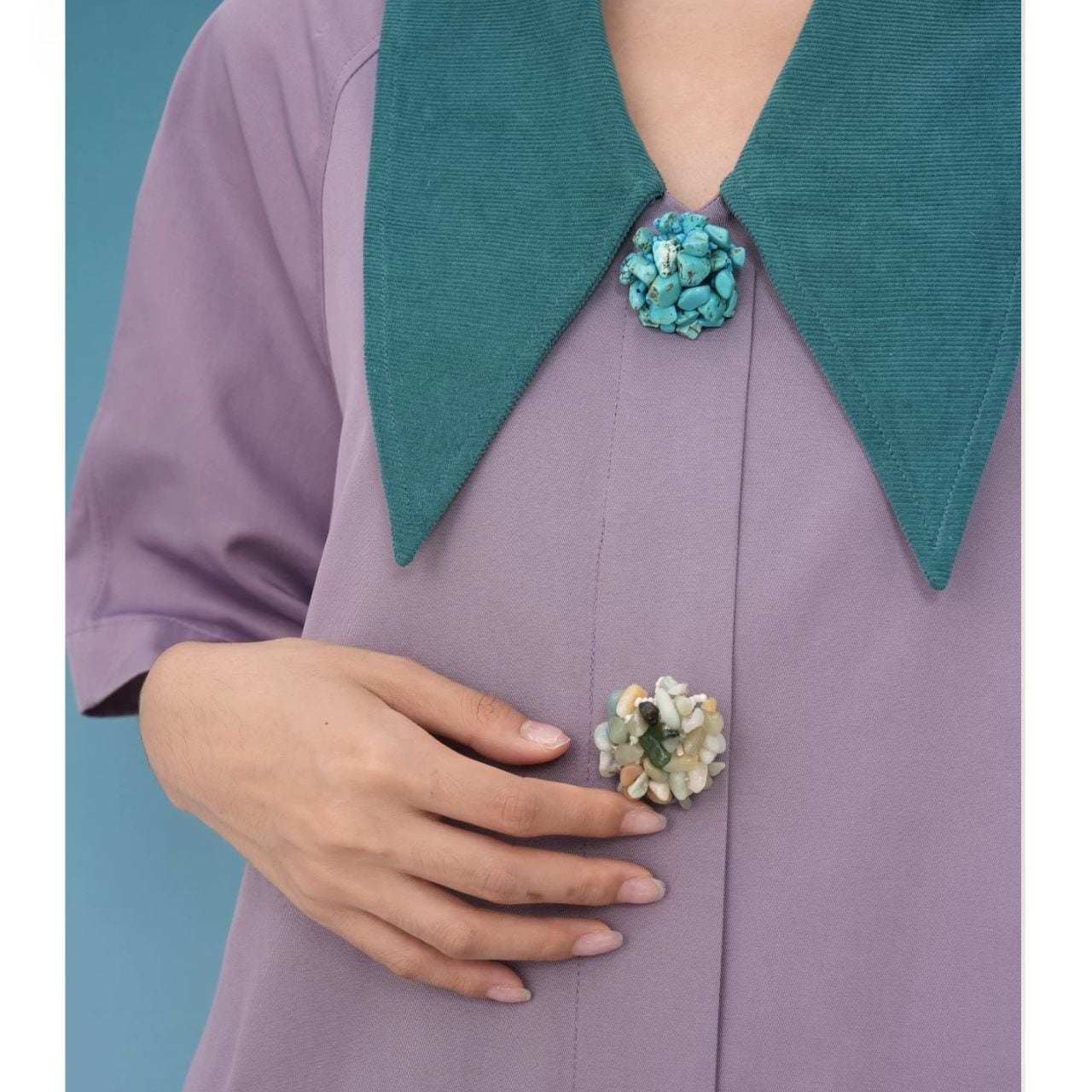 天然石のようなボタンがアクセントになったデザイン。