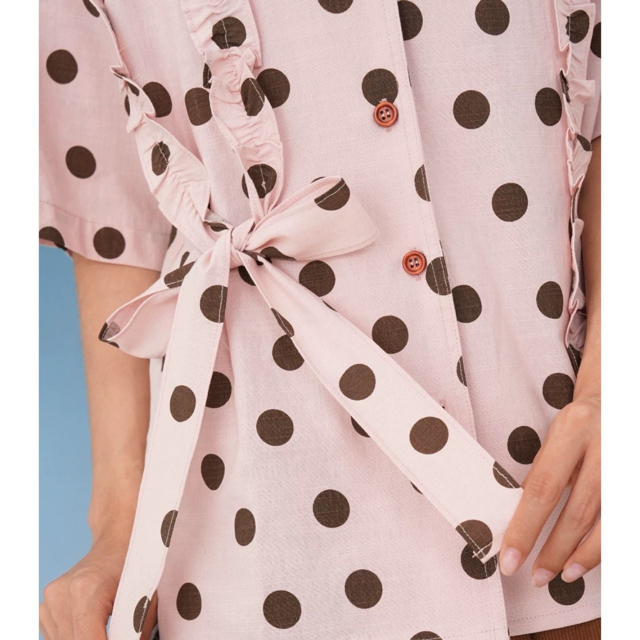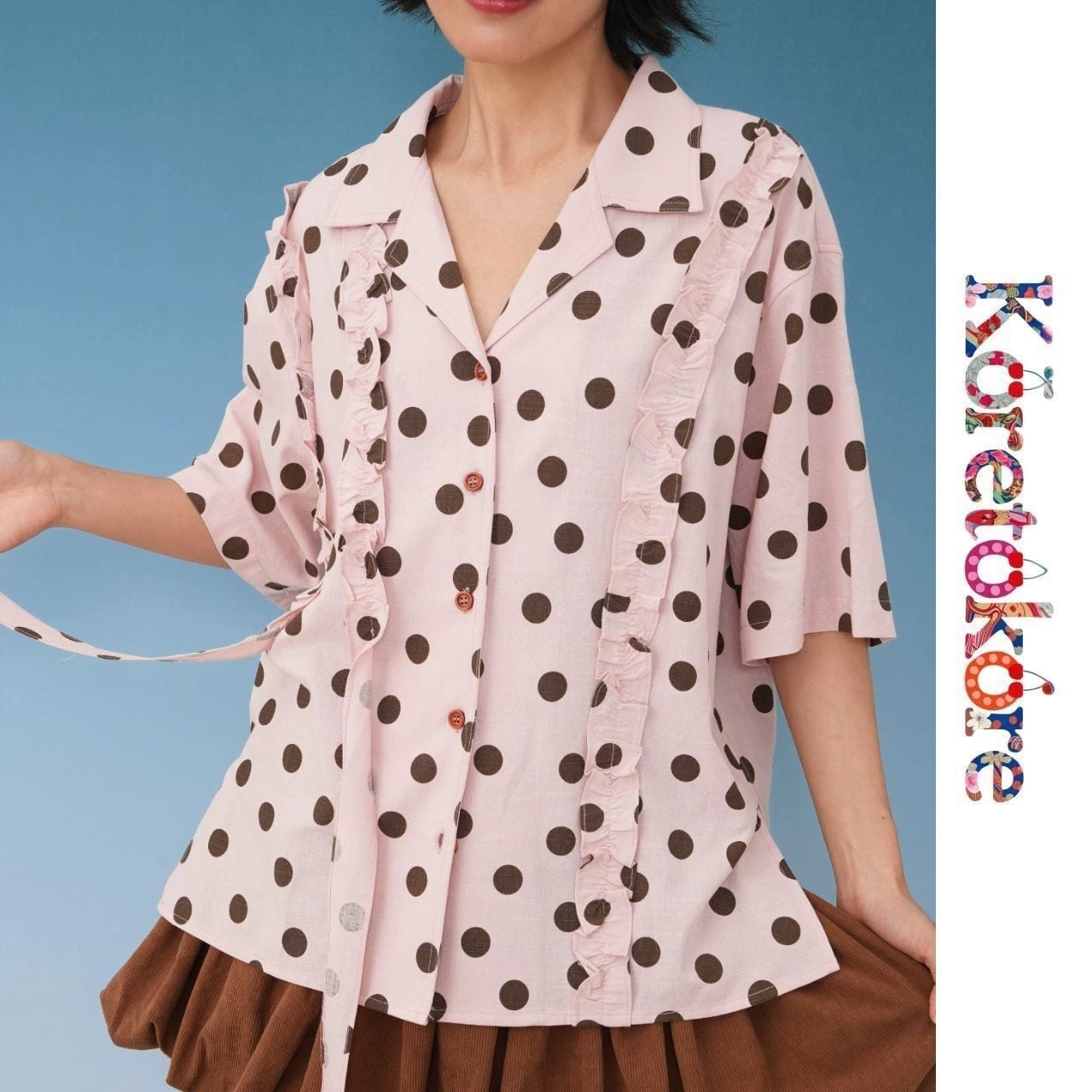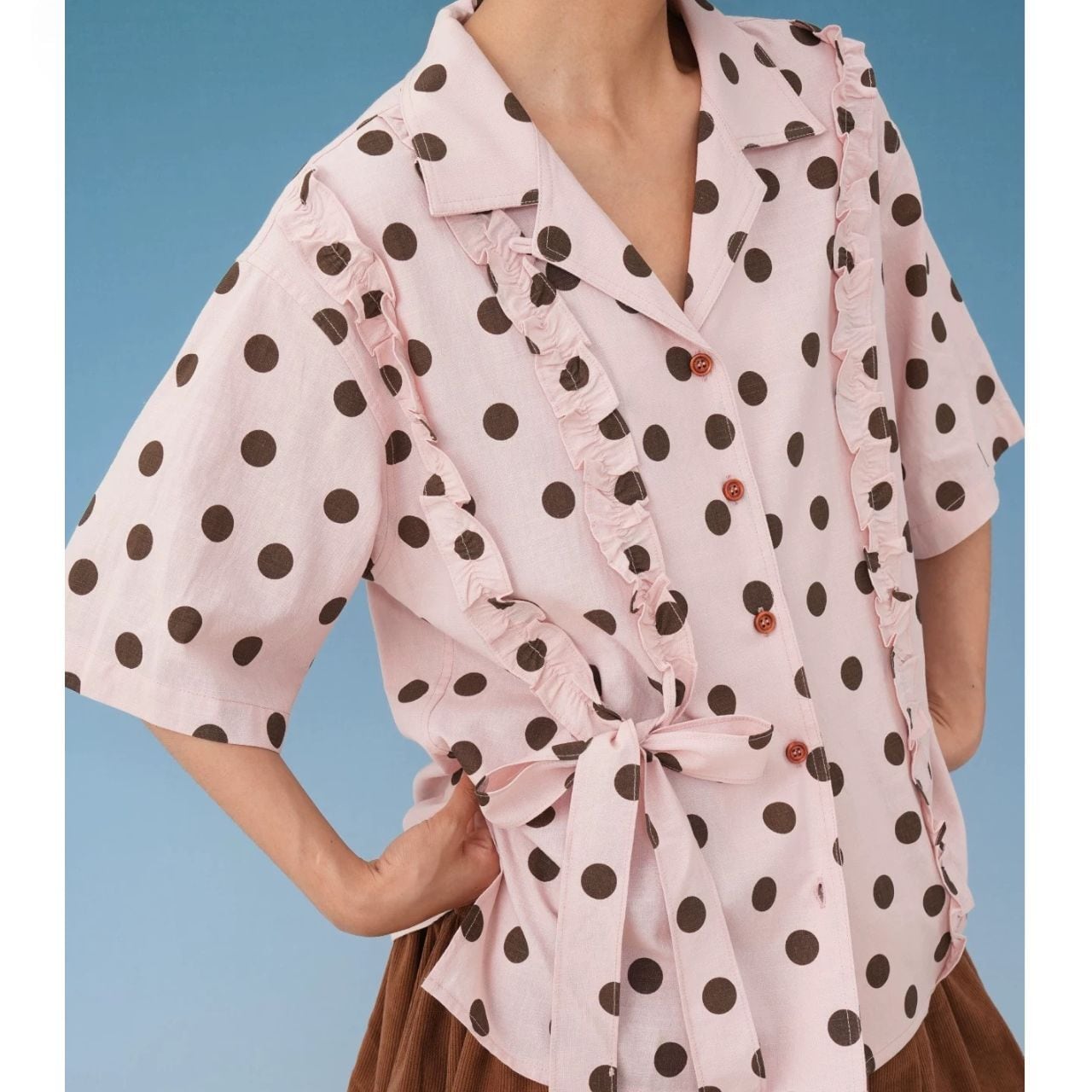 細かいドット柄に、フリルとリボンデザインをプラスした主役トップス。